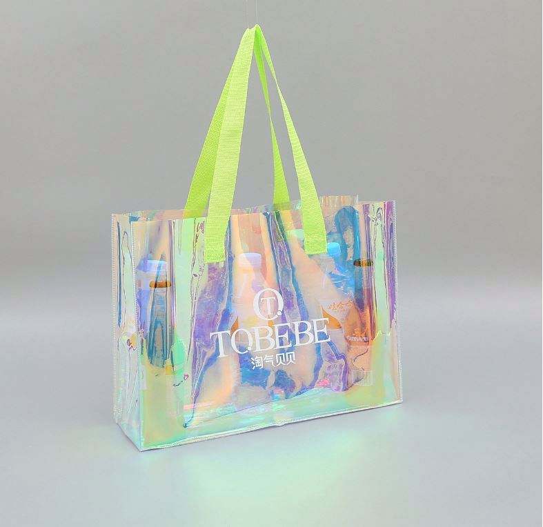 ถุงพีวีซีเลเซอร์พร้อมหูหิ้วถุงบรรจุและของขวัญใช้ซ้ำได้ในชีวิตประจำวัน