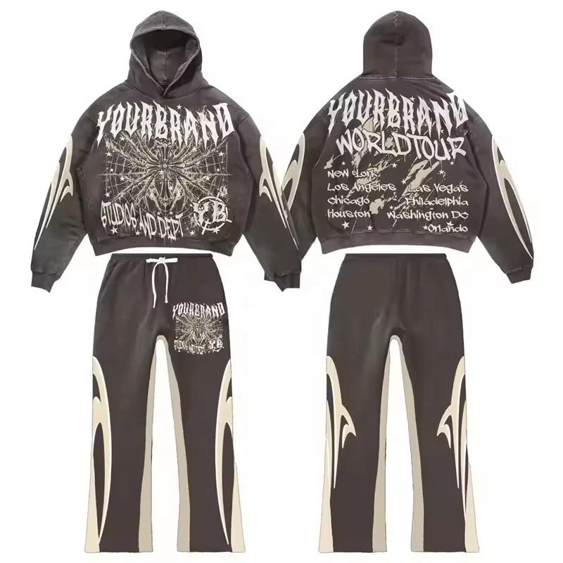 ชุดวอร์ม2ชิ้นแบบมีฮู้ด & กางเกงผ้าฝ้าย100% พิมพ์ลายล้างกรดสไตล์วินเทจชุดวิ่งจ๊อกกิ้งกางเกงบานมีฮู้ด & กางเกงวอร์ม