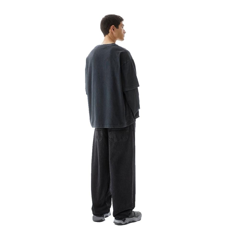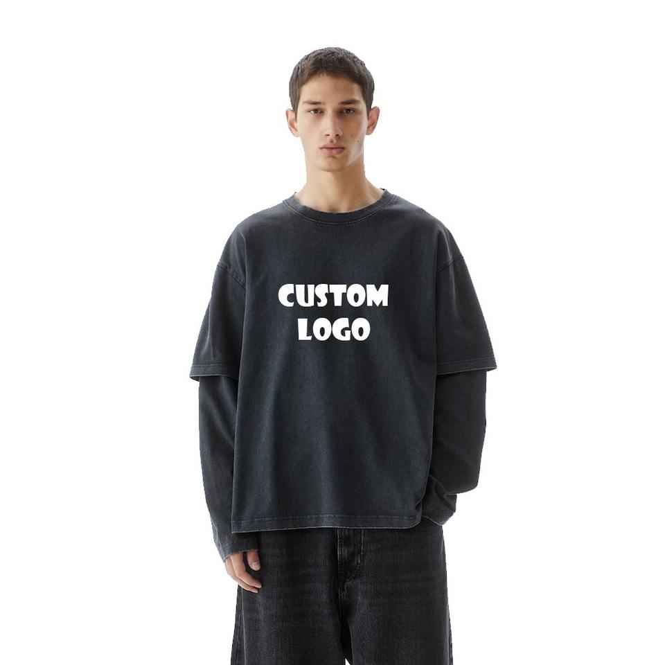 เสื้อยืดคอกลมแขนยาวผ้าฝ้าย100% ลำลองโอเวอร์ไซส์สำหรับผู้ชายซักได้โลโก้แบบสองชั้น