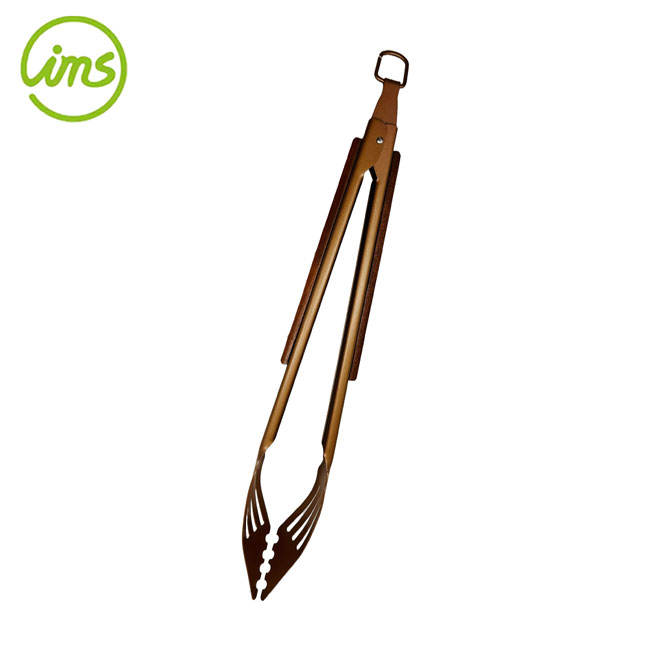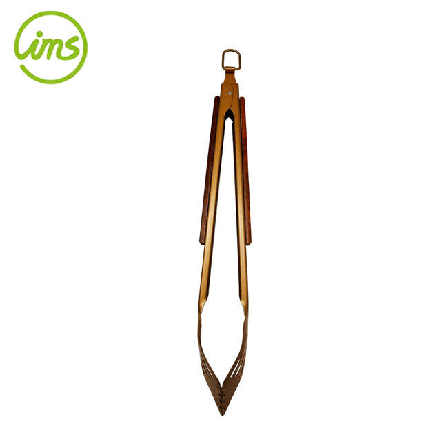 คีมคีบบาร์บีคิวพร้อมที่จับไม้เครื่องมือโลหะปรับแต่งโลโก้ได้ตามต้องการ
