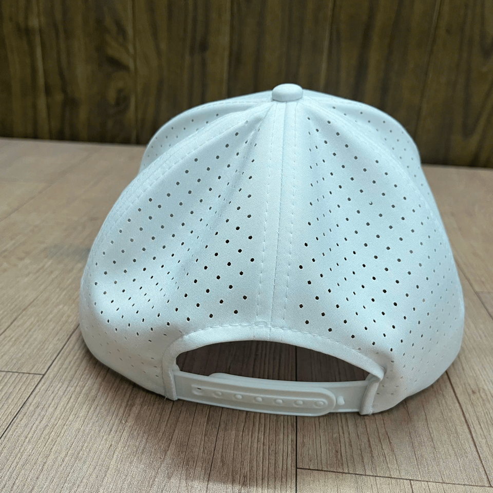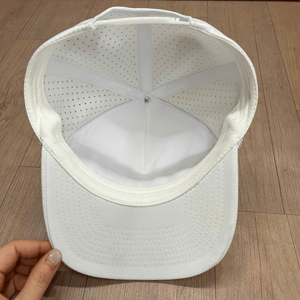 หมวกเบสบอล5แผงปักโลโก้กำหนดเองหมวกแก็ปยางพีวีซีมีรูตัดด้วยเลเซอร์หมวกกีฬากอล์ฟปีกโค้งกันน้ำพร้อมเชือก