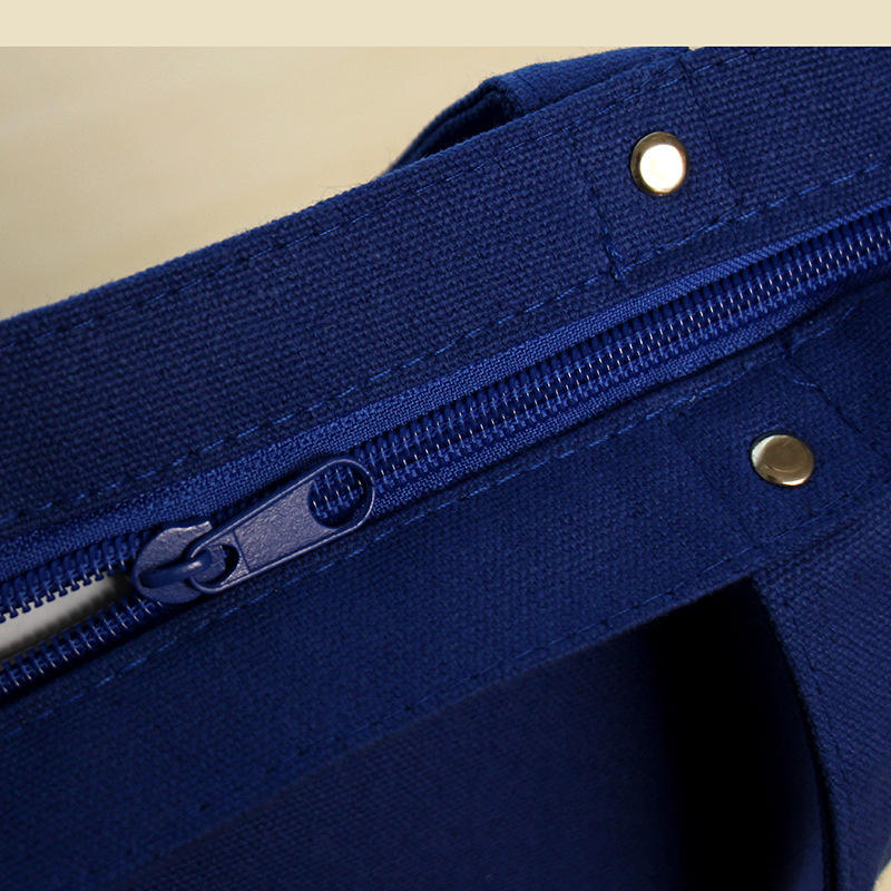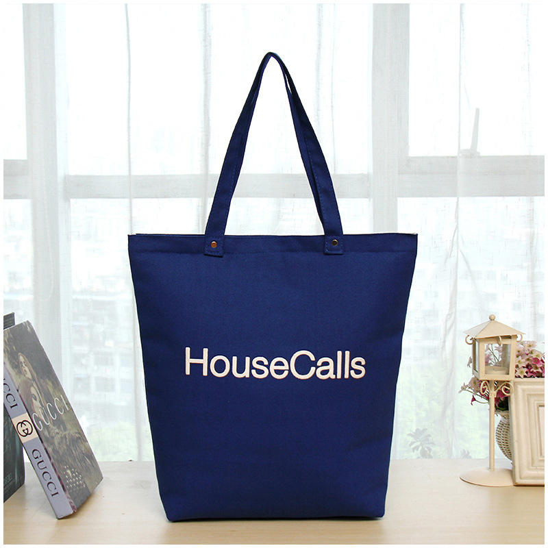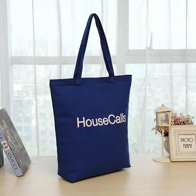 กระเป๋าช้อปปิ้งผ้าแคนวาสสีน้ำเงินขนาดใหญ่แบบใช้ซ้ำได้ พร้อมโลโก้และดีไซน์แฟชั่นตามสั่ง