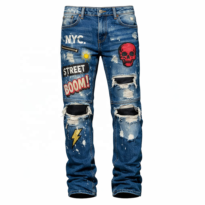 กางเกงยีนส์เดนิมทรงตรงเอวกลางผ้าฝ้าย 100% สไตล์วินเทจลำลองสำหรับผู้ชายลายปักโลโก้แบบกำหนดเองสไตล์ฮิปฮอปสำหรับฤดูร้อน