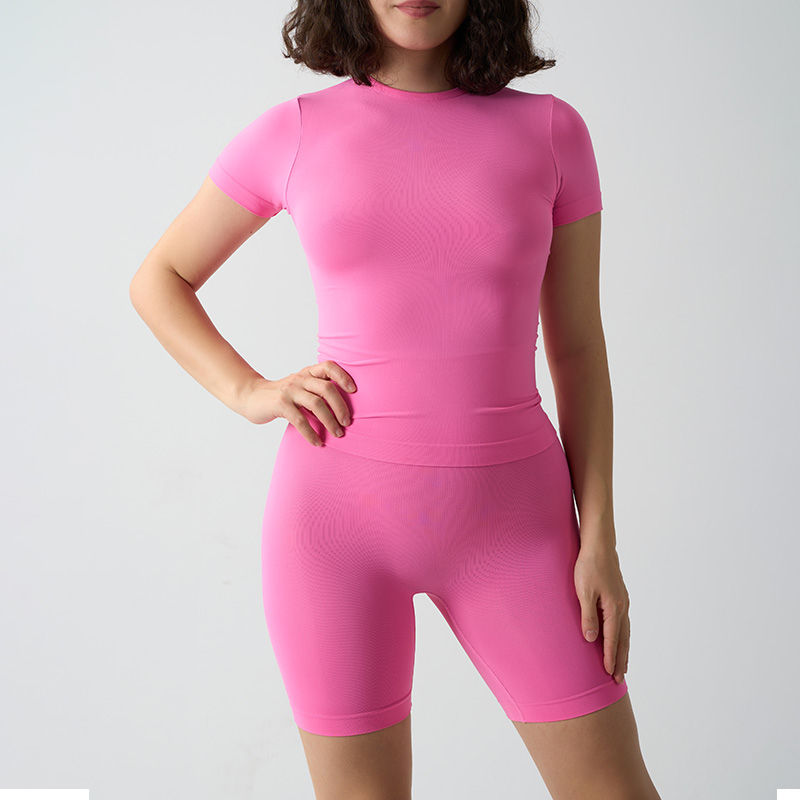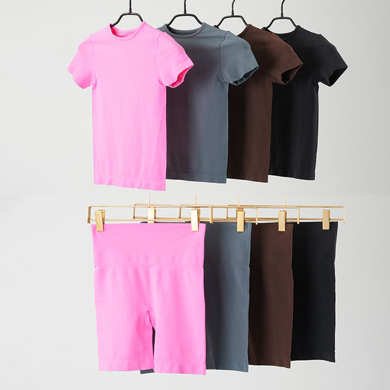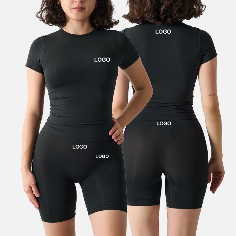 เสื้อยืดและกางเกงขาสั้นผู้หญิงผ้าอีลาสเทนเนื้อนุ่มไร้รอยต่อ คอกลม แขนสั้น สกรีนโลโก้ได้ตามต้องการ ชุดโยคะสำหรับใส่เป็นชุดชั้นใน