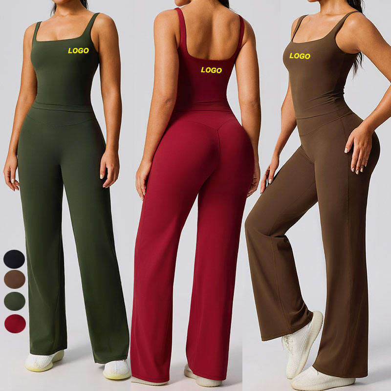 Customized Logo Womens Sportswear Suspender Vest Tummy Control Flare Pants Yoga Clothes High Waist Gym Breathable Solid