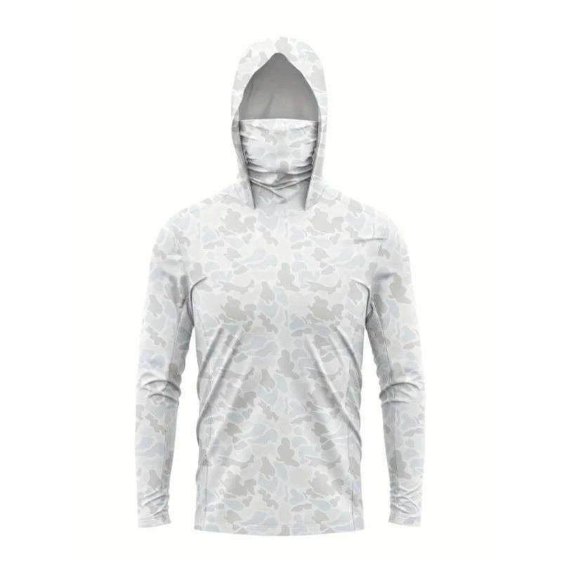 เสื้อฮู้ดตกปลาโพลีเอสเตอร์แห้งเร็ว พิมพ์ลายแบบซับลิเมชั่นตามสั่ง MOQ ต่ำ ป้องกันแสงแดด UPF 50
