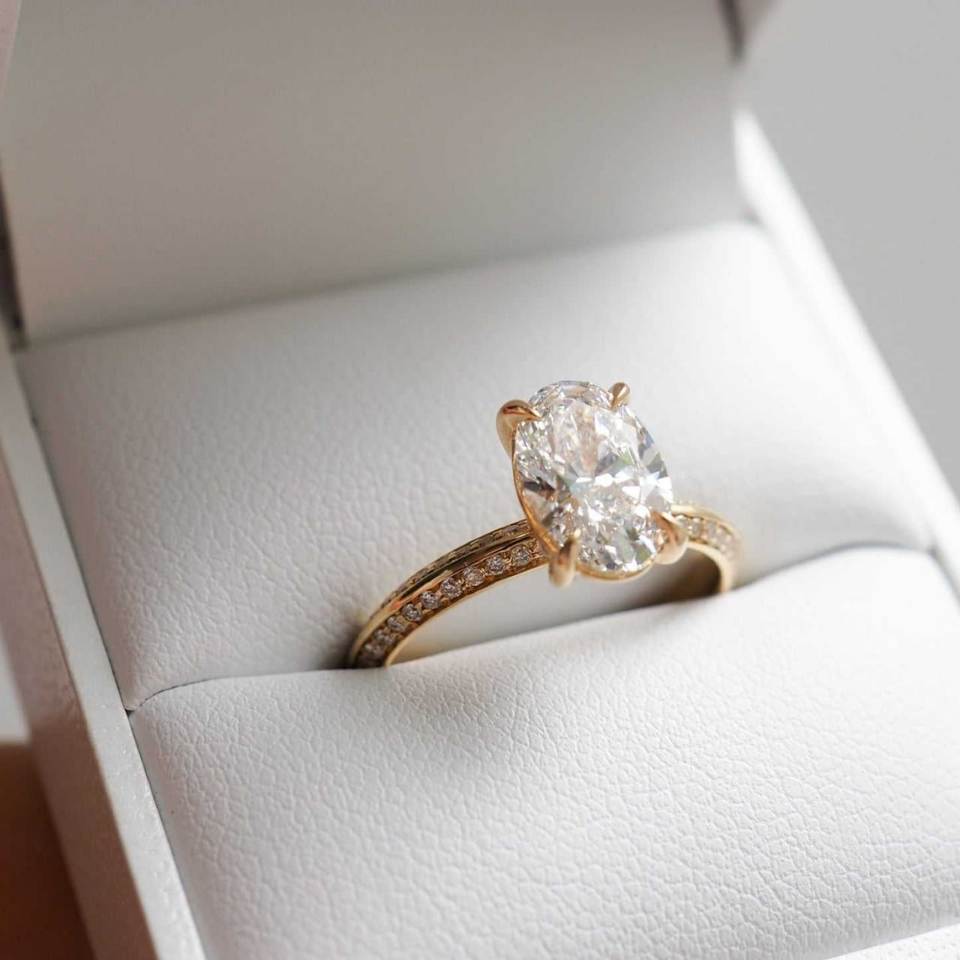 แหวนหมั้นทำจากทองเหลือง14K ที่กำหนดเองได้รับการรับรองว่าเป็นรูปไข่ตัดในห้องปฏิบัติการเครื่องประดับเพชร CVD เพชรชั้นดีสำหรับผู้หญิง