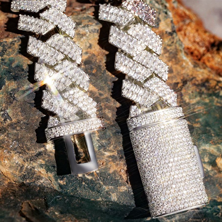 สร้อยคิวบาลิงค์แบบกำหนดเอง หรูหรา เงินแท้ S925 ประดับเพชรแบบ Iced Out สไตล์ฮิปฮอป ขนาด 20 มม. หนัก 2 แถว แบบบาแกตต์ เครื่องประดับสร้อยคิวบาลิงค์