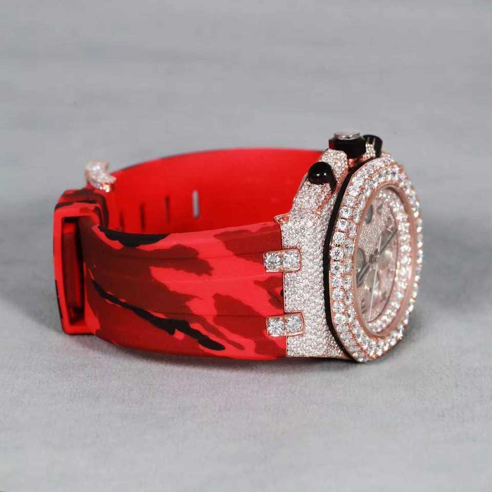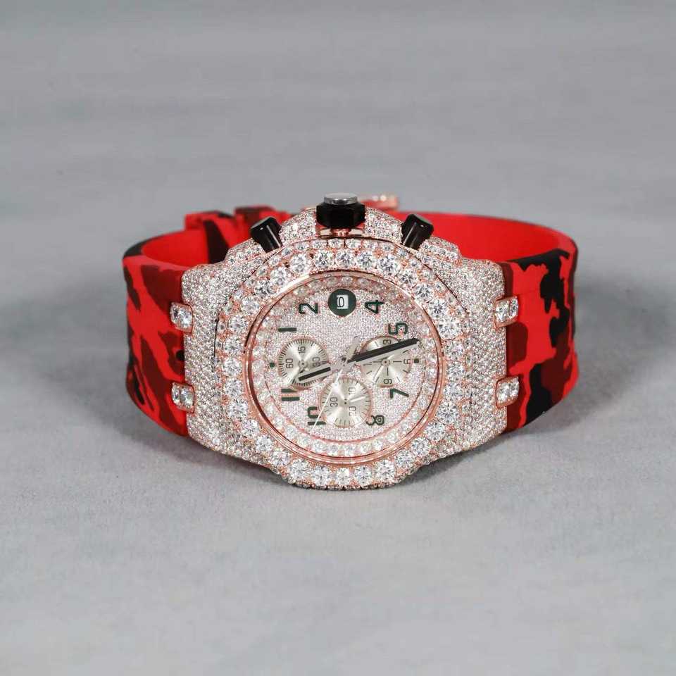 นาฬิกาสไตล์ฮิปฮอปสุดหรูแบบกำหนดเอง หน้าปัดอนาล็อก ETA คุณภาพสูง ประดับเพชรโมอิสซาไนต์สองสี สายยางสีแดง