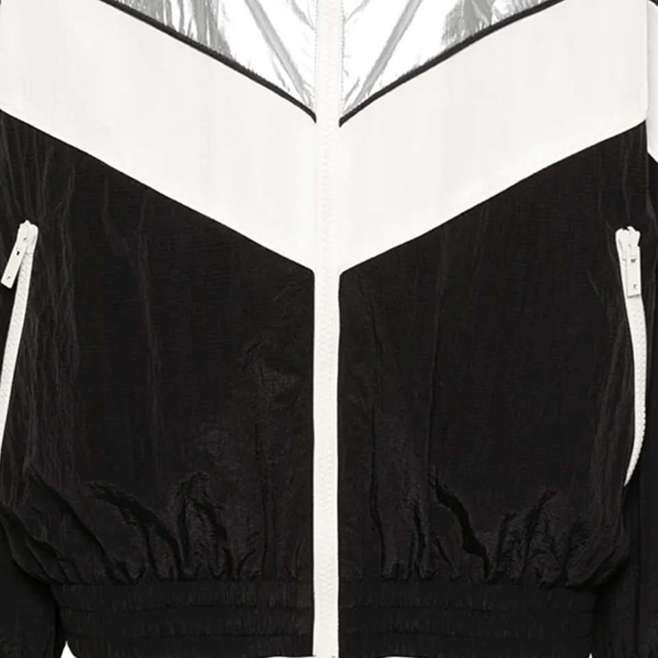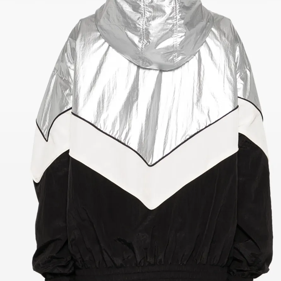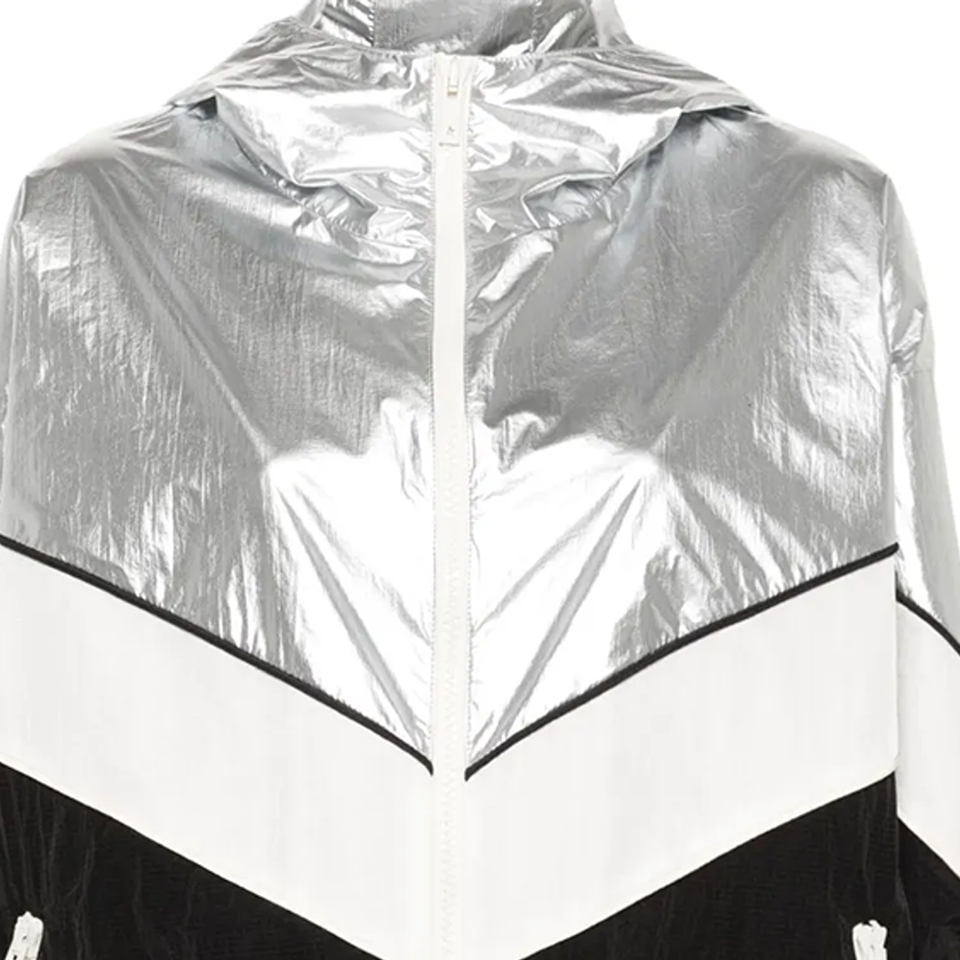 เสื้อแจ็คเก็ตกันลมกันน้ำ Letizia รุ่นปรับแต่งได้สำหรับทุกเพศ สีดำ ขาว เงิน ลายพิมพ์บล็อกสี ซิปด้านหน้าและด้านข้าง ไซส์พลัส