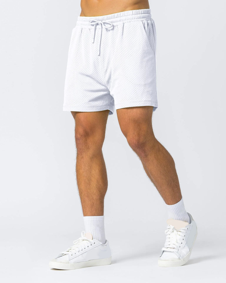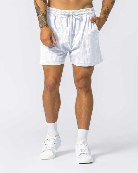 กางเกงขาสั้นตาข่ายผู้ชายสีขาวทรงหลวมแบบสั่งทำพิเศษ พร้อมขอบเอวยางยืดและกระเป๋าข้าง ผลิตจากผ้าตาข่ายน้ำหนักเบา