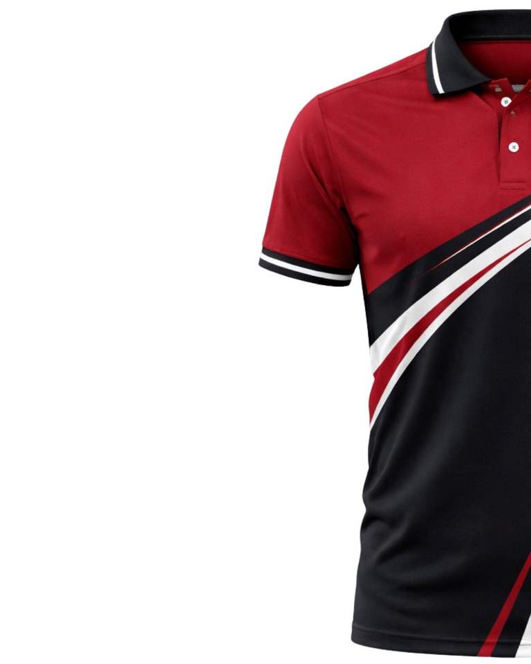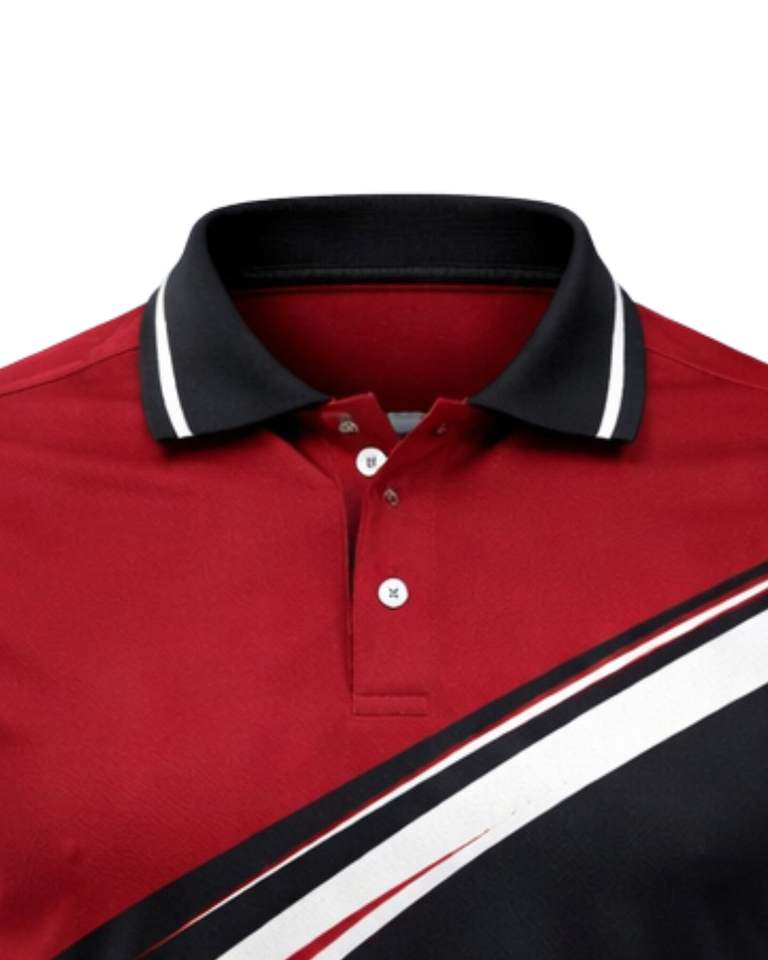 เสื้อโปโลชายสีแดงดำแบบกำหนดเอง แขนสั้น ตัดต่อสีตัดกัน สวมใส่สบาย ระบายอากาศได้ดี ผลิตจากโพลีเอสเตอร์ เหมาะสำหรับกีฬากอล์ฟ เทนนิส และเป็นชุดยูนิฟอร์ม