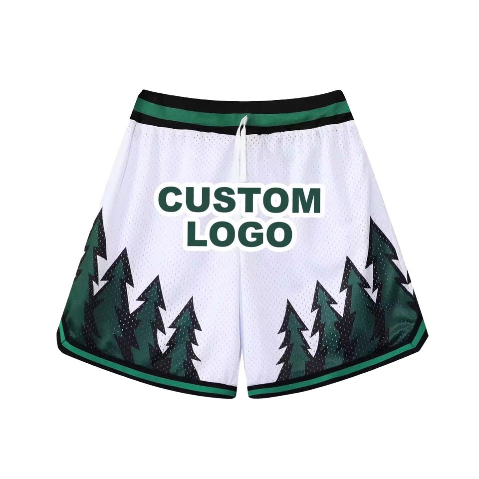 กางเกงขาสั้นสำหรับฝึกซ้อมบาสเก็ตบอลของผู้ชายกางเกงขาสั้นโพลีเอสเตอร์ตาข่ายแบบระเหิดเข้ารูปพิมพ์โลโก้แบบสองด้านลึกมีกระเป๋าสำหรับฤดูร้อน