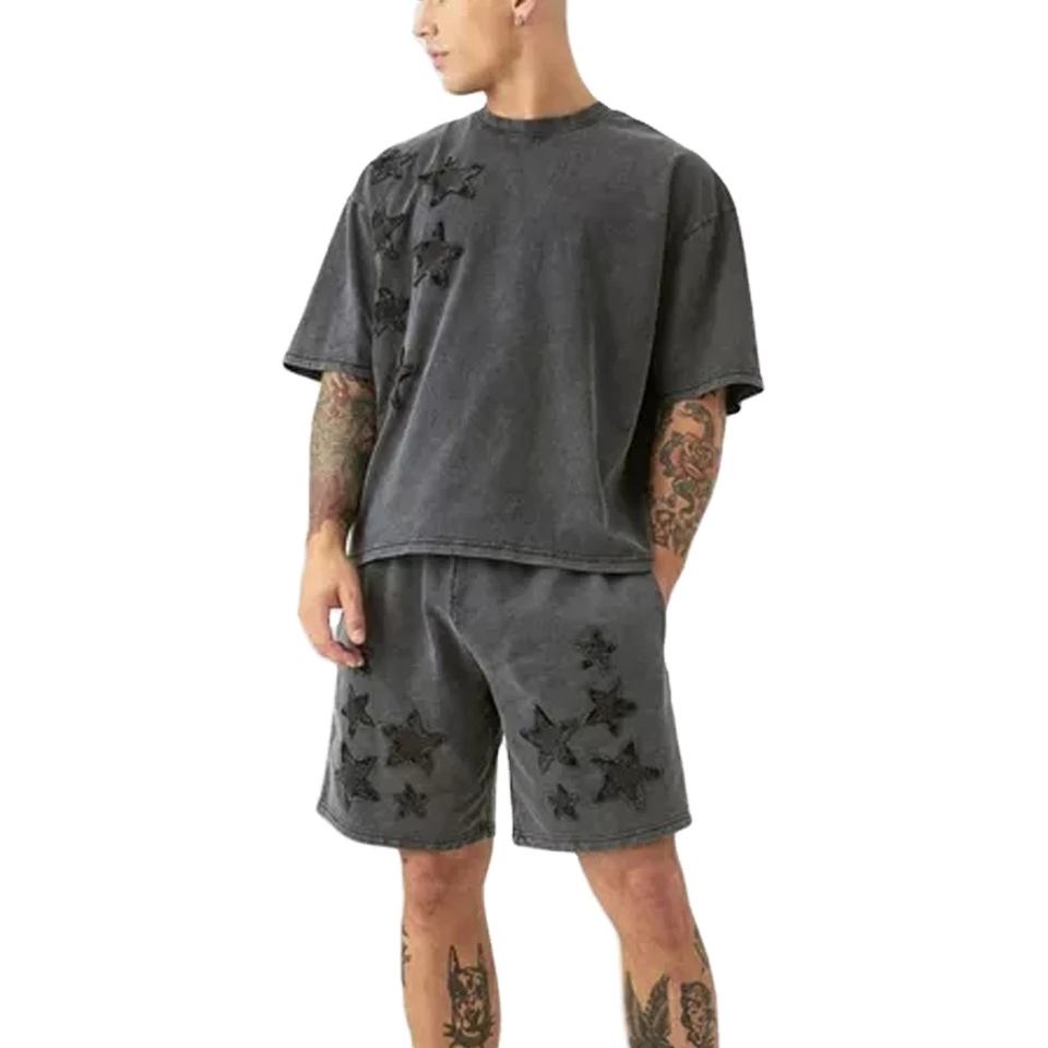 ชุดเซ็ตเสื้อยืดแขนสั้นสีดำสำหรับผู้ชายแบบกำหนดเอง 2 ชิ้น พร้อมงานปักแบบดิสเทรส เสื้อผ้าผู้ชายไซส์ใหญ่
