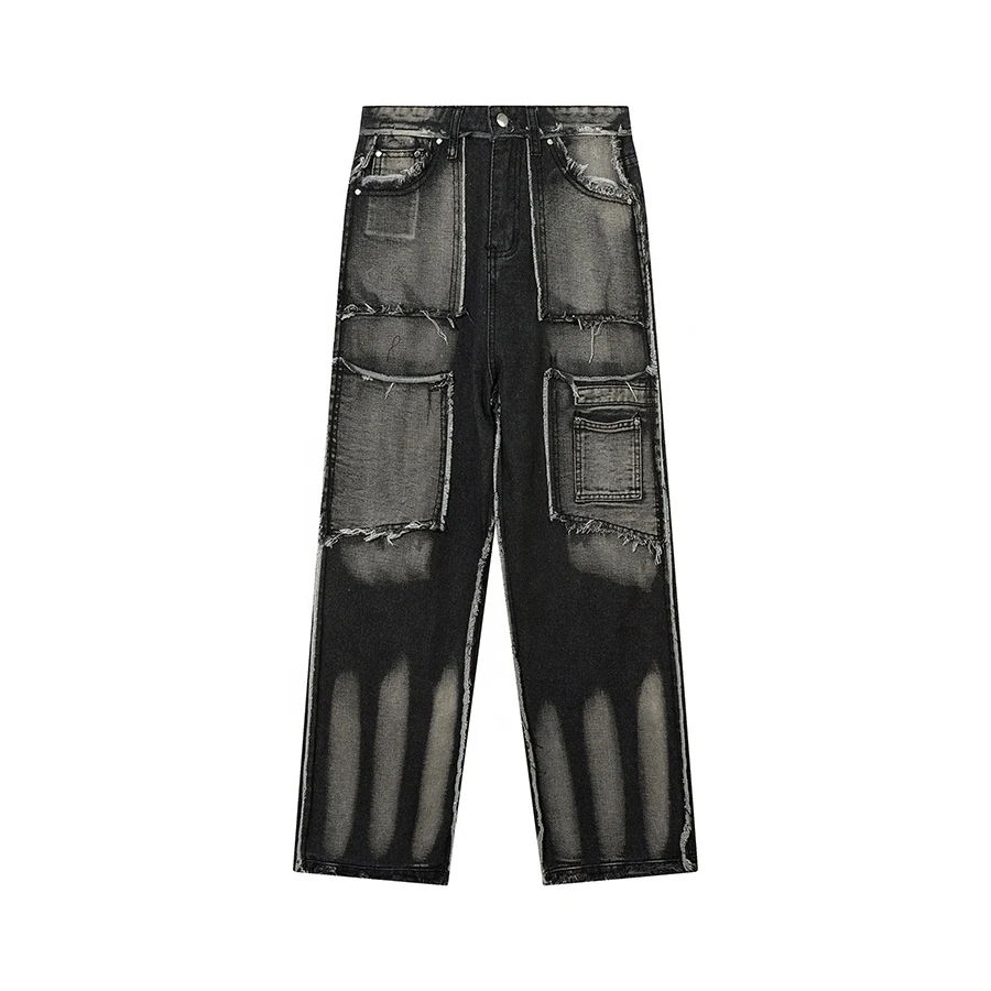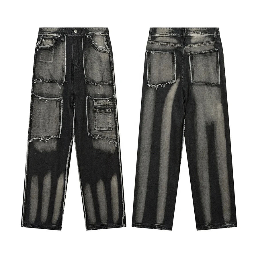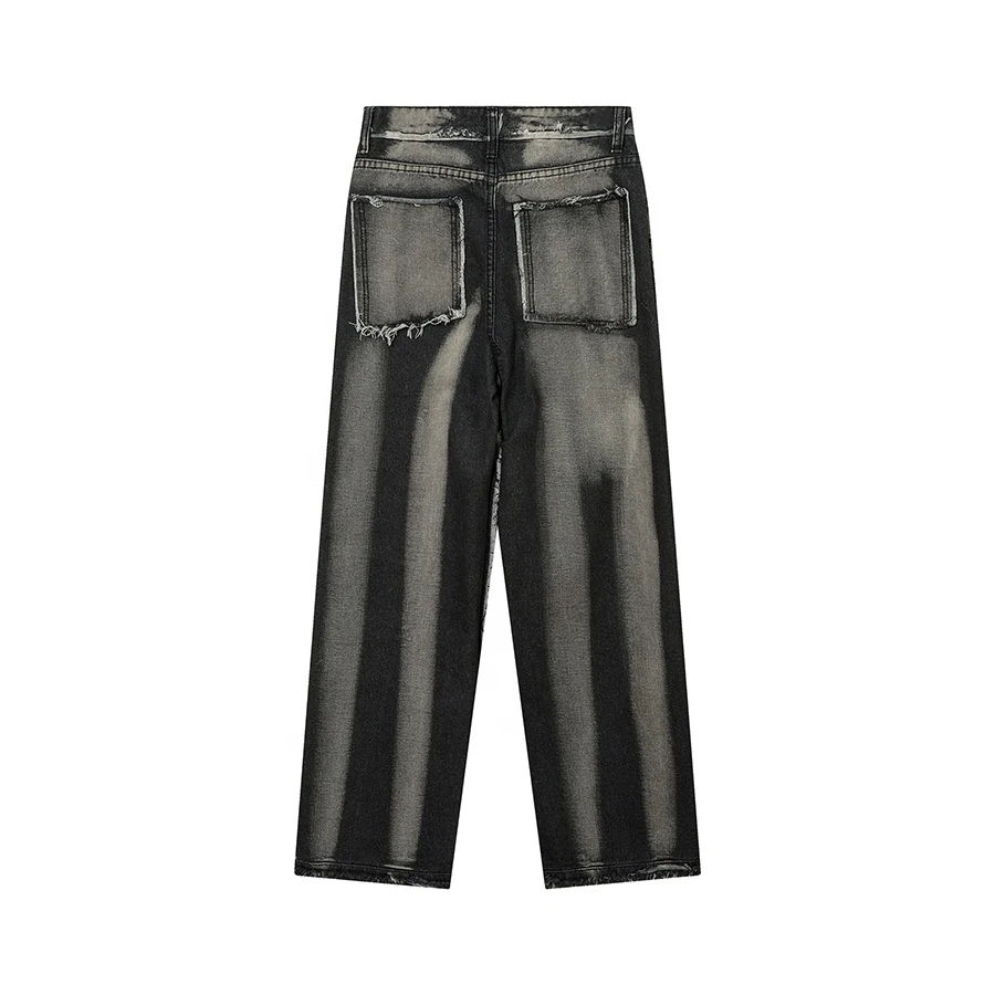 กางเกงยีนส์เดนิมทรงขากว้างเอวสูงสีดำฟอกซีดสไตล์วินเทจสำหรับผู้ชายแบบสั่งทำพิเศษ สวมใส่สบายสไตล์ลำลองแนวสตรีท