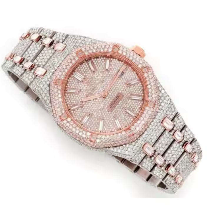 นาฬิกาเพชรโมอิสสไตล์ฮิปฮอปของผู้ชายแบบกำหนดเองได้แสดงวันที่แบบอนาล็อกแสดงวันที่เคสเหล็กโบราณหน้าปัดแก้วแฟชั่น