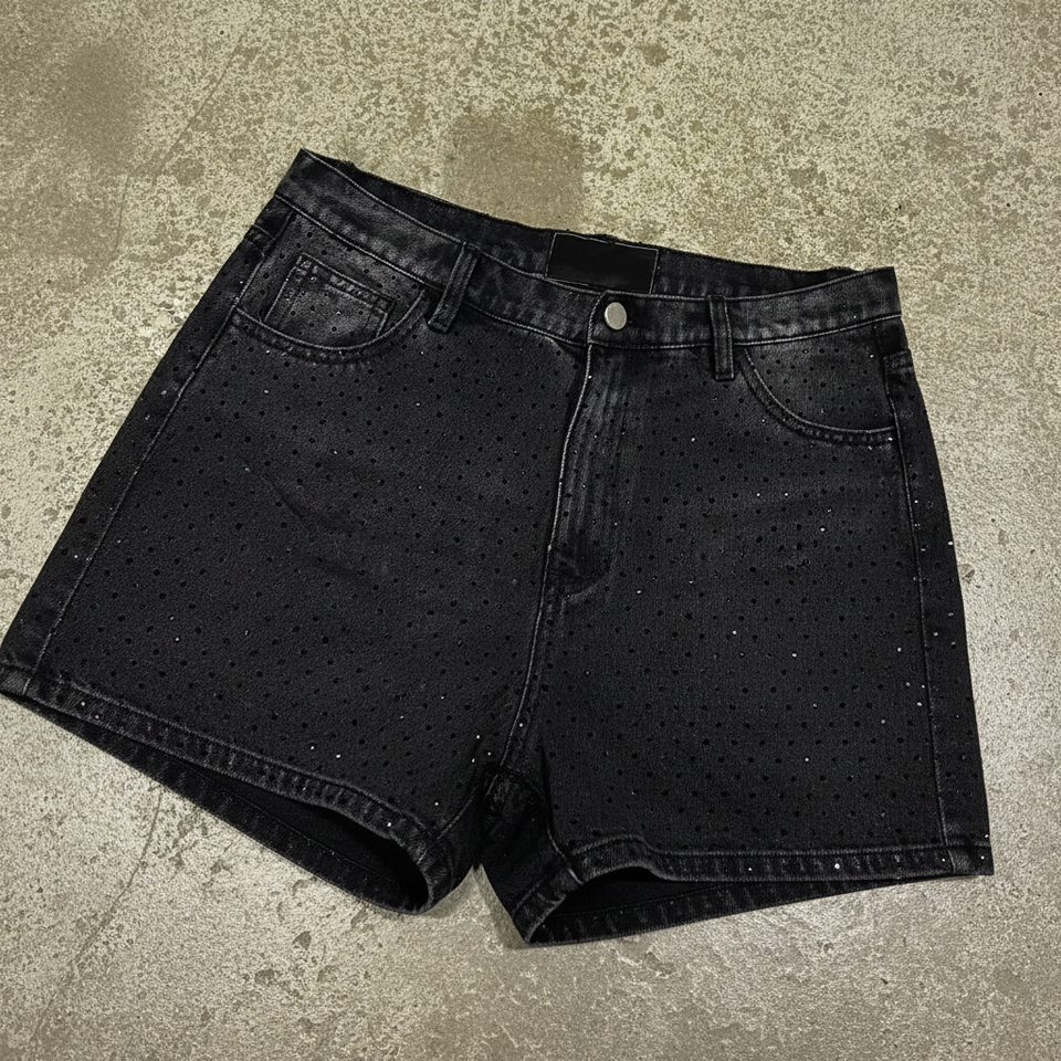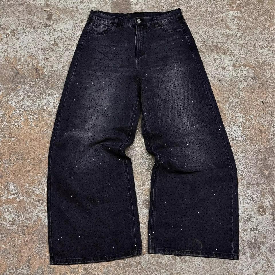 กางเกงยีนส์เดนิมสีดำทรงหลวมสไตล์สตรีทแวร์สำหรับผู้ชาย แต่งขาด ล้างสี ปักลาย ประดับเพชร ซิปหน้า
