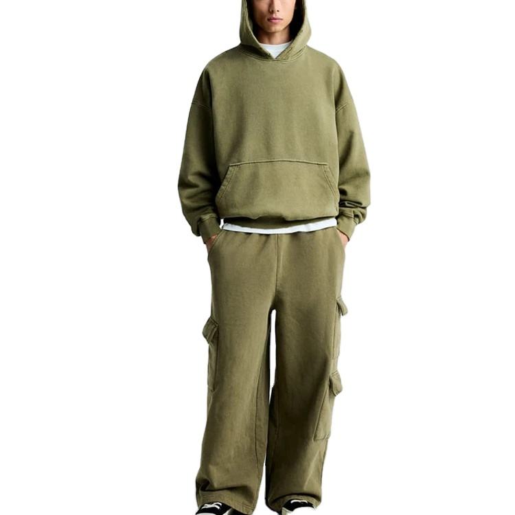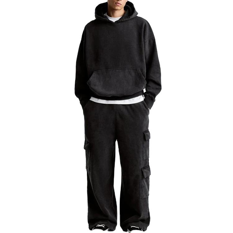 ชุดวอร์มผู้ชายแบบมีฮู้ดสั่งทำพิเศษ เนื้อผ้าหนา ทรงโอเวอร์ไซส์ ไหล่ตก กางเกงคาร์โก้ ผ้าฝ้าย 100% ชุดลำลองแบบเรียบง่าย