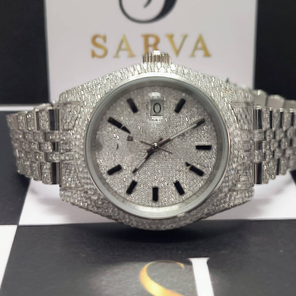 นาฬิกาสปอร์ตประดับเพชรทำจากสเตนเลสสตีลของผู้ชายสามารถปรับแต่งได้เคสแซฟไฟร์แบบเฉพาะสไตล์ฮิปฮอปพร้อมสายหนัง