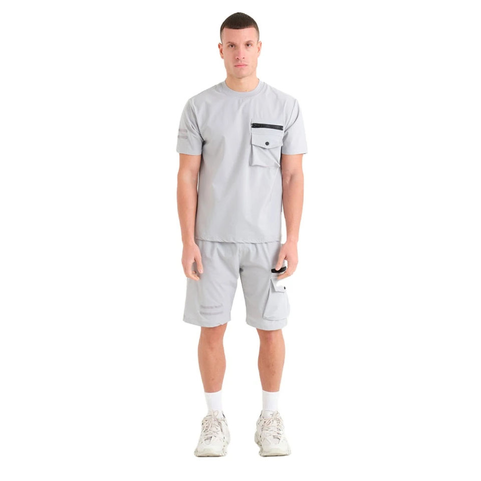 ชุดกีฬาผู้ชายแบบสองชิ้นสีเทา เสื้อยืดและกางเกงขาสั้นพร้อมดีไซน์ลายทางที่แขนเสื้อ เหมาะสำหรับใช้ในชีวิตประจำวันและการออกกำลังกาย