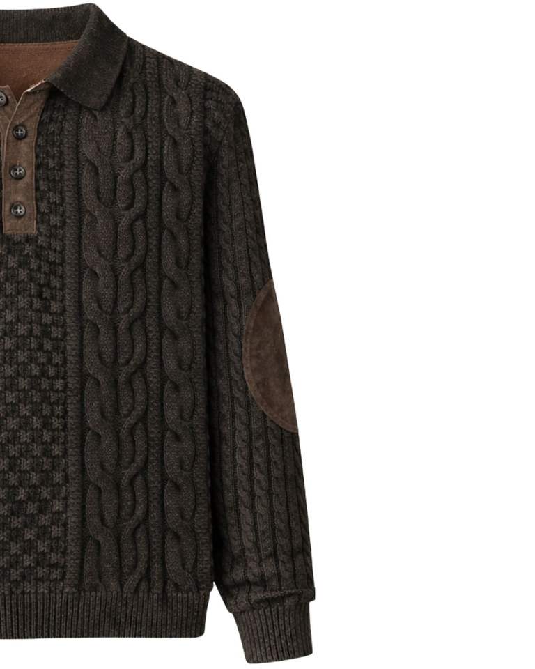 เสื้อโปโลถักไหมพรมผสมผสานสำหรับผู้ชาย แขนยาว คอติดกระดุม แบบสวมหัว สำหรับฤดูหนาว พร้อมแผ่นปะที่ข้อศอก สีน้ำตาลเข้ม