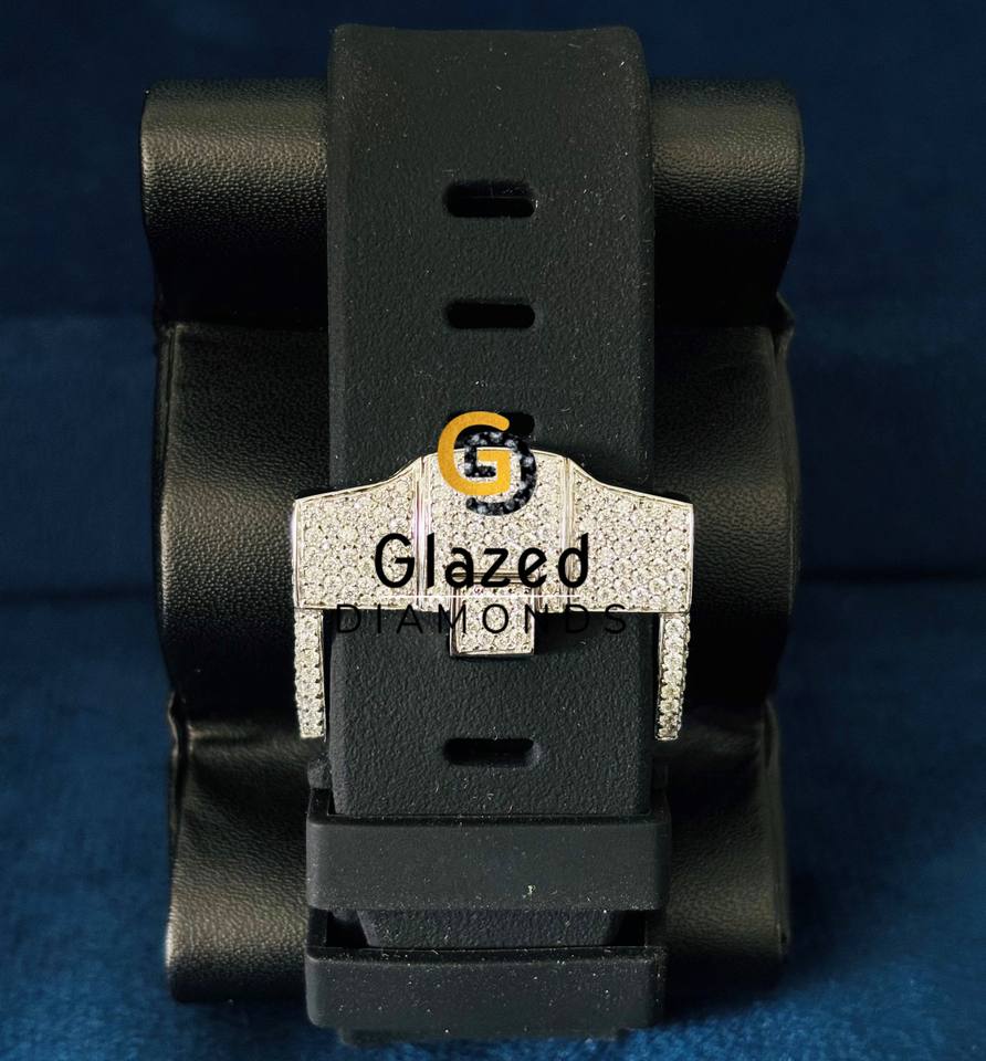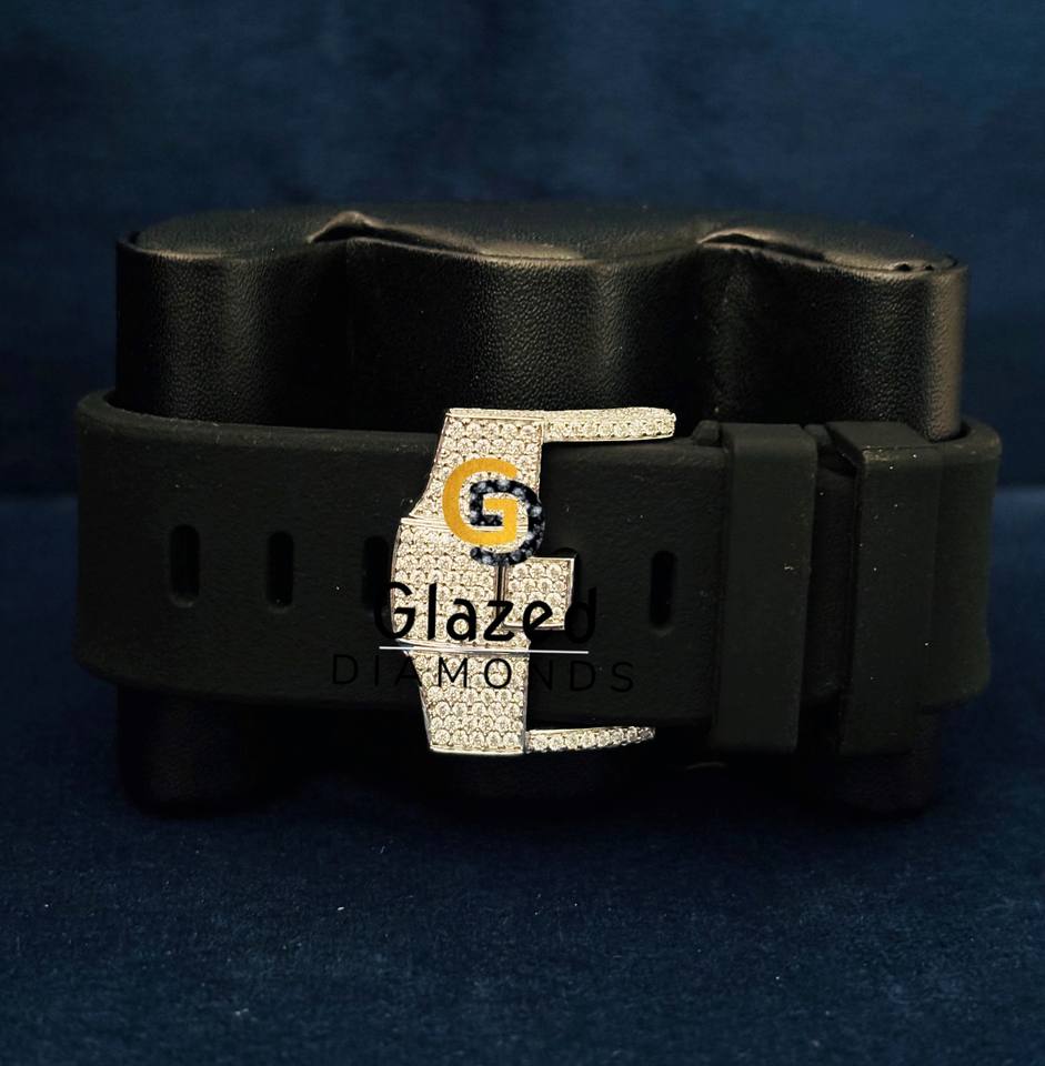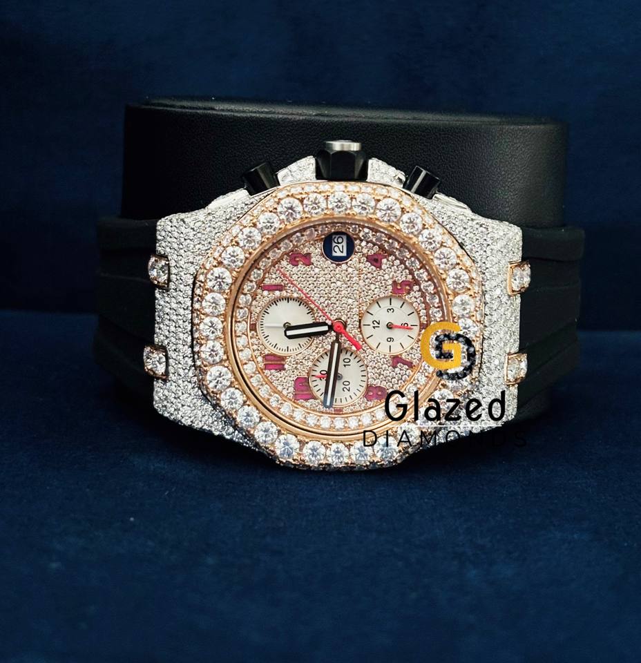 หน้าปัดนาฬิกาหรูหราสองสีสำหรับผู้ชายแบบกำหนดเอง ประดับเพชรโมอิสซาไนต์ความใส VVS พร้อมสายยางสีดำ