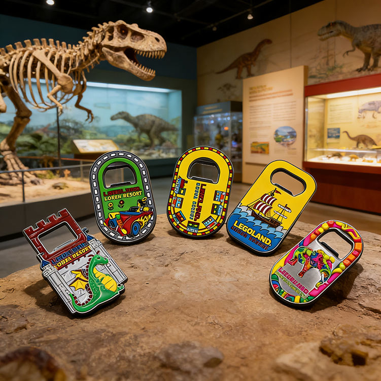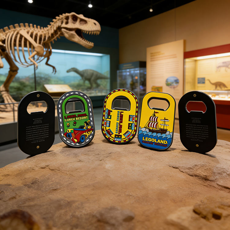 แม่เหล็กติดตู้เย็นลายไดโนเสาร์เคลือบอีพ็อกซี่เมทัลลิกแบบกำหนดเอง ของที่ระลึกจากพิพิธภัณฑ์ พร้อมที่เปิดขวด