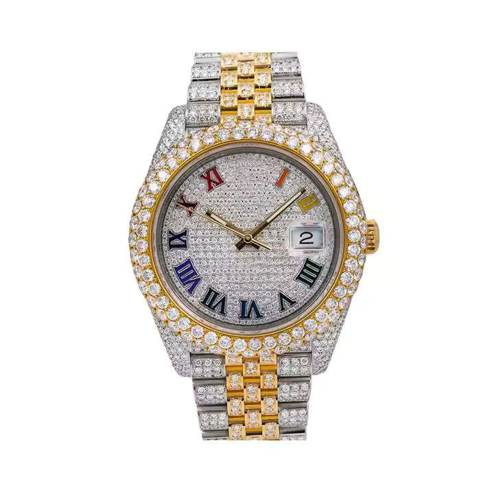นาฬิกาควอตซ์ Miyota แบบกำหนดเอง พร้อมเพชรโมอิสซาไนต์ ดีไซน์หรูหรา ตัวเลขหลากสี สำหรับแฟชั่น/กีฬา/ธุรกิจ