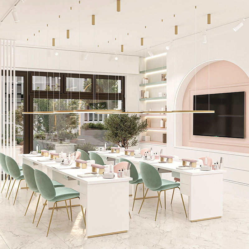โต๊ะทำเล็บไม้แบบปรับแต่งได้ทันสมัยไฟ LED การออกแบบเฟอร์นิเจอร์หรูหราสำหรับร้านเสริมสวย