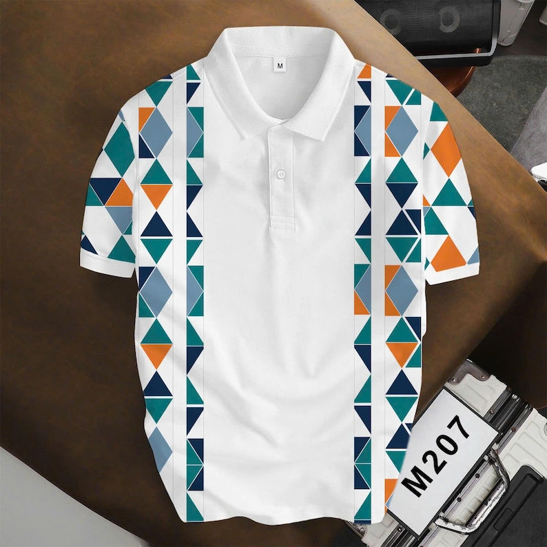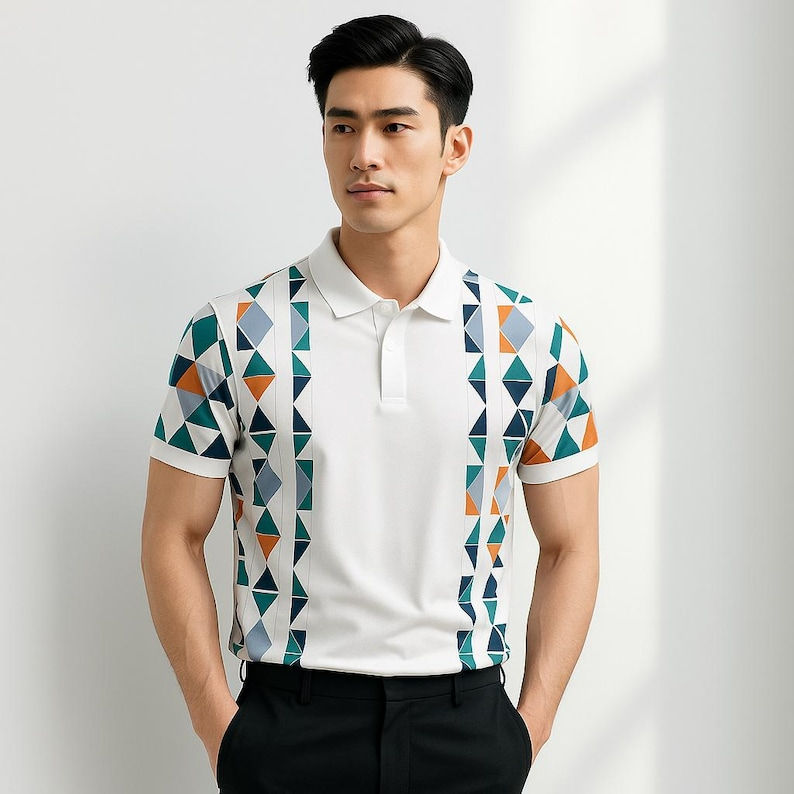เสื้อโปโลผู้ชายสไตล์โมเดิร์นแบบสั่งทำพิเศษ ชุดฤดูร้อน ลายพิมพ์สามเหลี่ยมนามธรรม ผ้าฝ้ายแคนวาสระบายอากาศได้ดี
