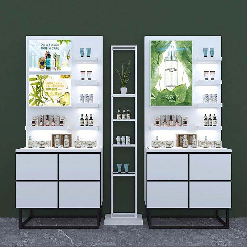 ตู้โชว์สินค้าปลีกสมัยใหม่แบบกำหนดเองสำหรับจัดเก็บผลิตภัณฑ์ดูแลผิว ไฟส่องสว่าง น้ำหอม ร้านเสริมสวย เครื่องสำอาง สำหรับร้านค้า สำหรับจัดแสดง
