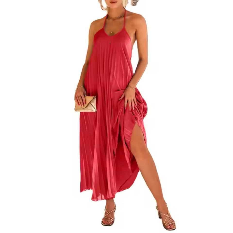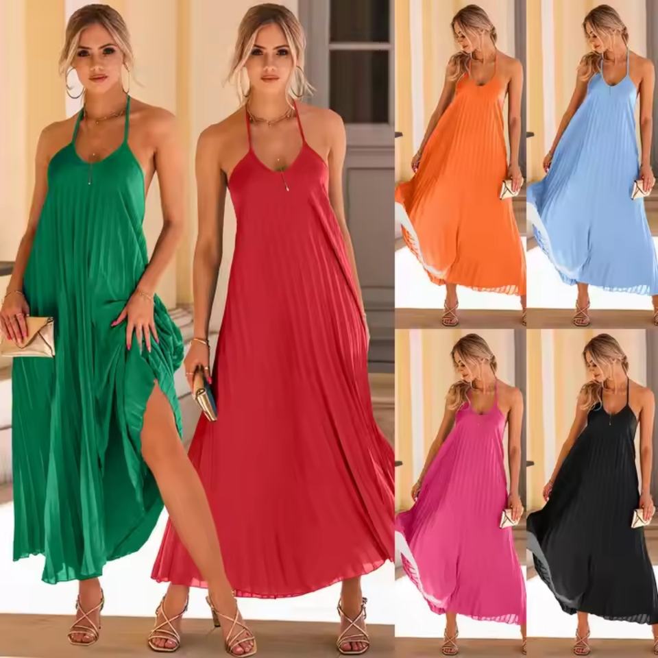 ชุดเดรสทรงเอไลน์สำหรับวันหยุดพักผ่อนริมชายหาดแบบเรียบง่าย ระบายอากาศได้ดี ออกแบบจีบพิเศษ ทันสมัยสำหรับผู้หญิง