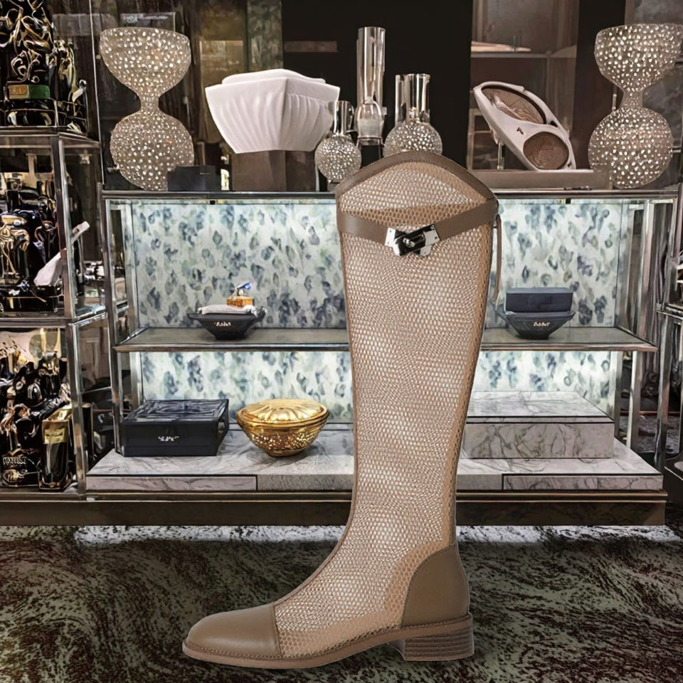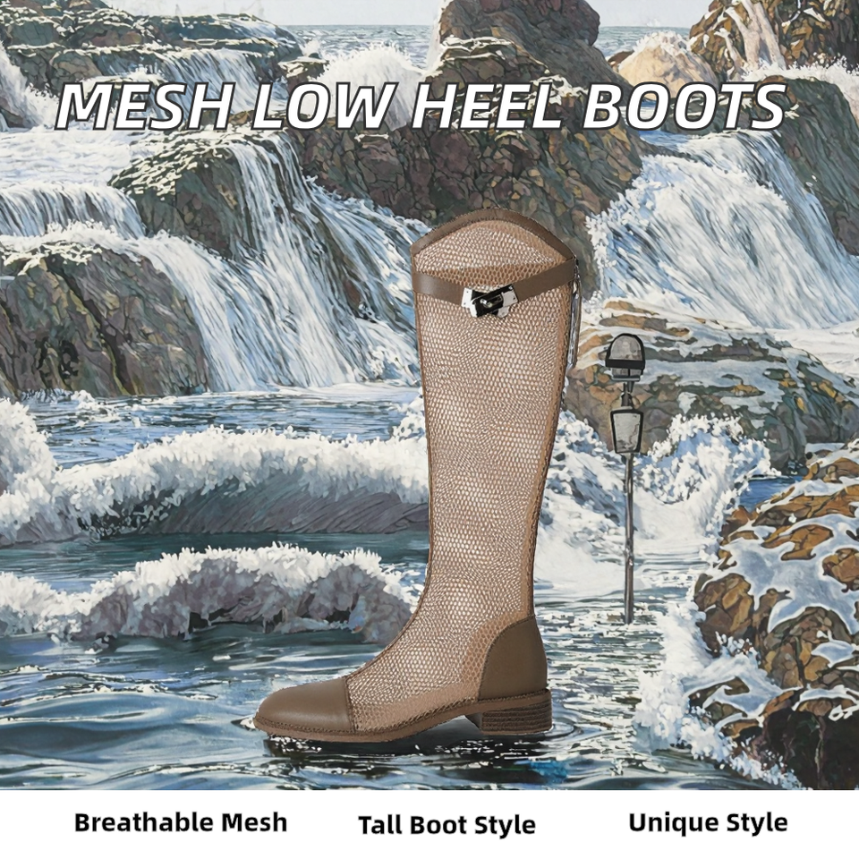 รองเท้าบูทผู้หญิงแบบยาวเหนือเข่า ดีไซน์ใหม่ ปรับแต่งได้ ส้นเตี้ย โปร่ง ระบายอากาศ ทำจาก PU กันลื่น เหมาะสำหรับฤดูหนาว มีเชือกผูก