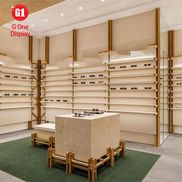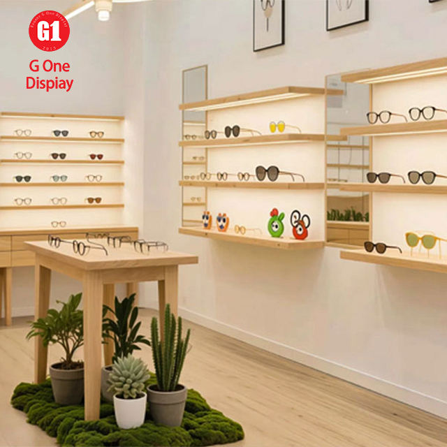 ตู้โชว์แว่นตาแบบกำหนดเอง ดีไซน์ไม้ติดผนัง พร้อมชั้นวางโชว์แว่นตาแบบมีกุญแจล็อค คุณภาพสูง