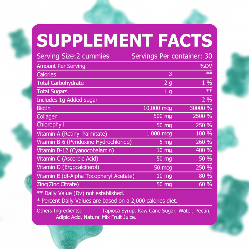 ส่วนผสมหลัก:ไบโอติน, คอลลาเจน, คลอโรฟิลล์, วิตามินเอ, วิตามินบี 6, วิตามินบี 12, วิตามินซี, วิตามินดี, วิตามินอี, สังกะสี