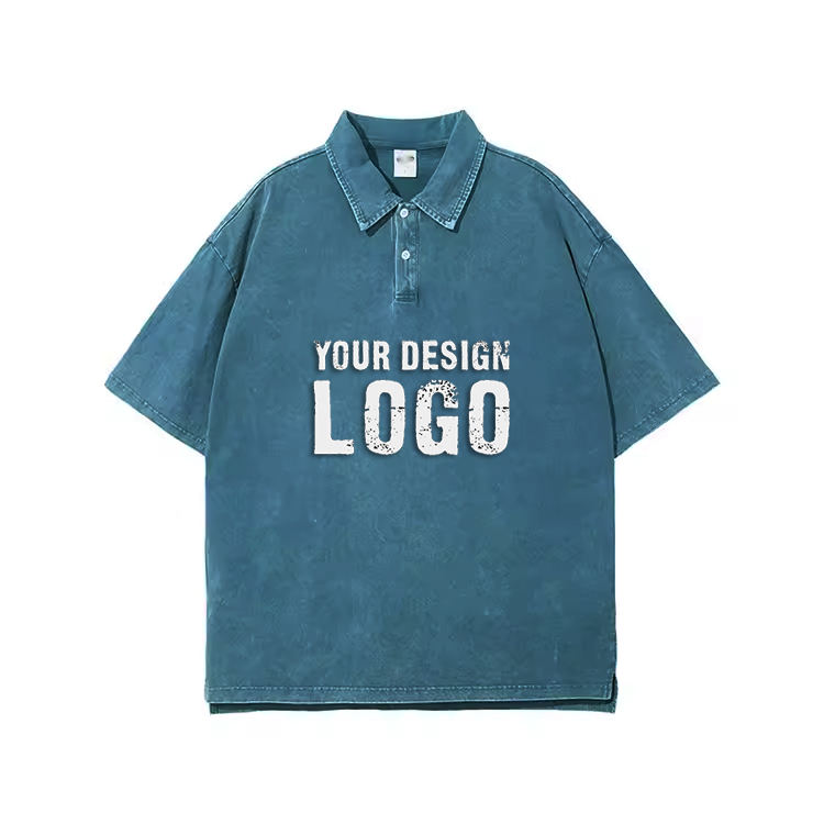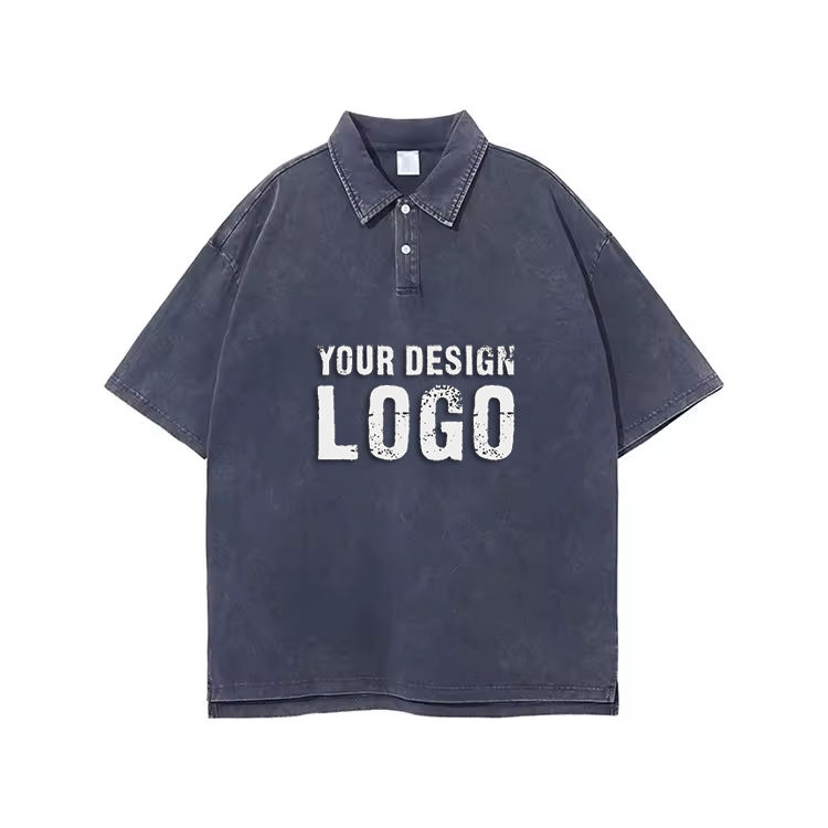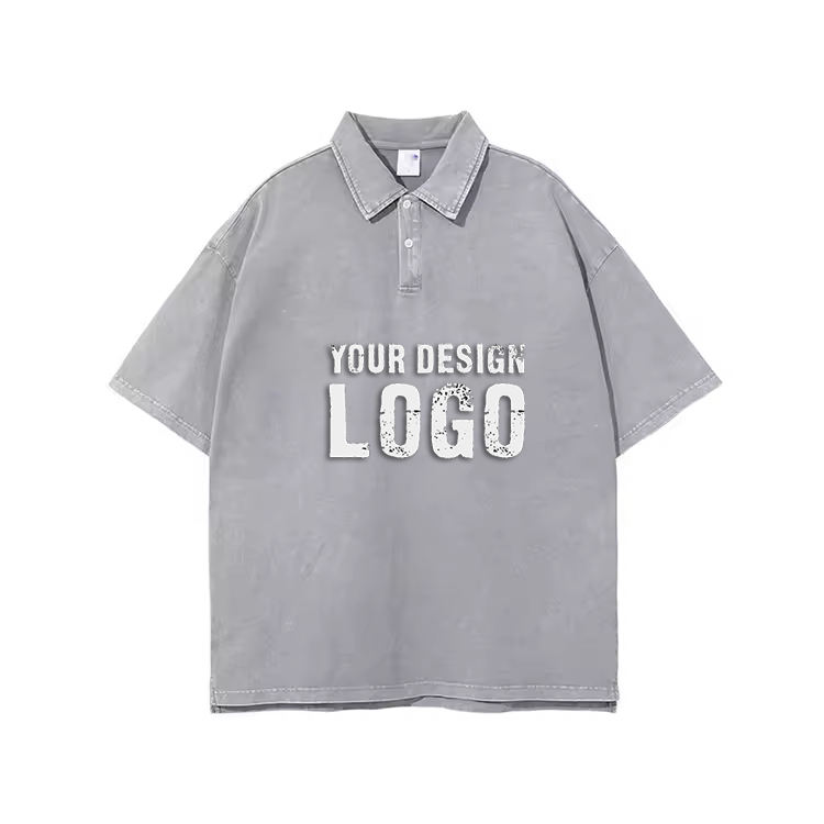 เสื้อโปโลผู้ชายสไตล์วินเทจผ้าฝ้ายลายพิมพ์แบบกำหนดเอง ทรงหลวม สตรีทฮิปฮอป ปกพับ ล้างสีแบบแอซิดวอช