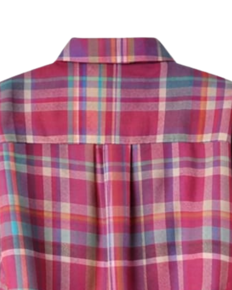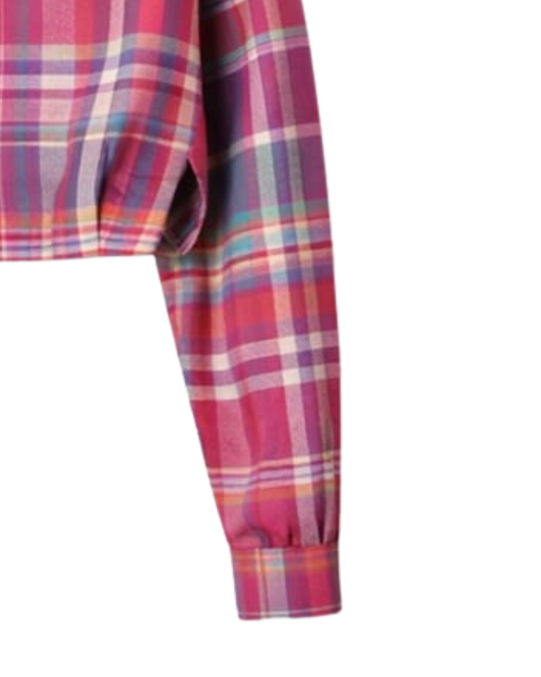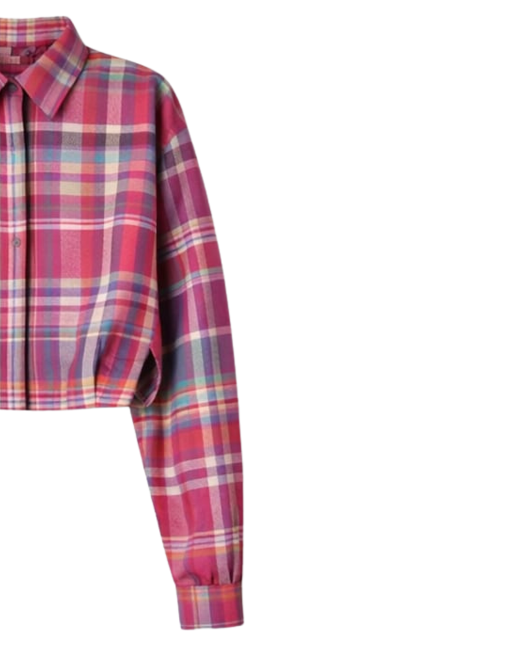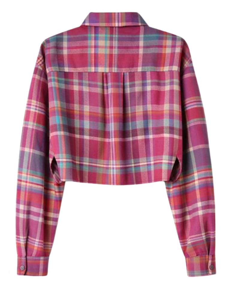 เสื้อเชิ้ตผู้หญิงลายสก็อตสีชมพูแบบครอป แขนยาว ติดกระดุม สไตล์ลำลอง แฟชั่นเสื้อเชิ้ตทรงสี่เหลี่ยม สำหรับฤดูใบไม้ผลิและฤดูร้อน รับผลิตตามแบบ OEM