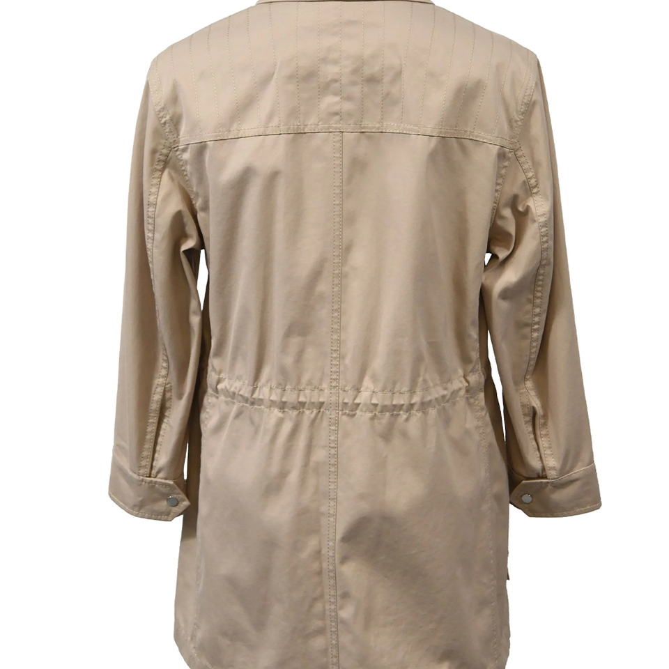 เสื้อแจ็คเก็ตกันลมกันน้ำสีเบจแบบมีกระเป๋าหน้าอก ขนาด 750 มม. สไตล์ซาฟารีคลาสสิก พิมพ์ลาย ปรับแต่งได้ ไซส์พลัส