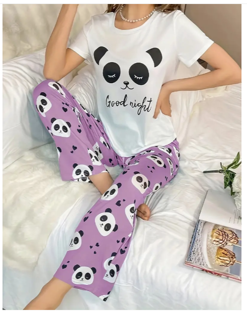 ชุดนอนแขนสั้นคอกลมและกางเกงเอวยางยืดสำหรับผู้หญิงชุดนอนและชุดอยู่บ้านพิมพ์ลายตามสั่ง