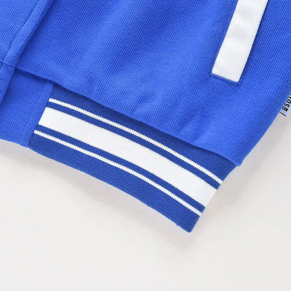 แจ็คเก็ตวาร์ซิตี้สีดำขาว แขนเสื้อผ้าโพลีเอสเตอร์/คอตตอนพิมพ์ลายตามสั่ง แต่งขอบตัดกัน ปักลายปักชื่อ/โลโก้ด้านหน้า แบบยูนิเซ็กซ์