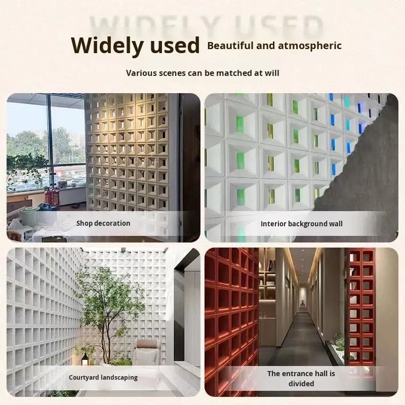 อิฐตกแต่งน้ำหนักเบาแบบกำหนดเองได้ ผลิตจาก PU รูปทรงกลวง แบ่งเป็นสองด้าน แบบกั้นห้อง 9 ช่อง ตกแต่งด้วยปูนซีเมนต์