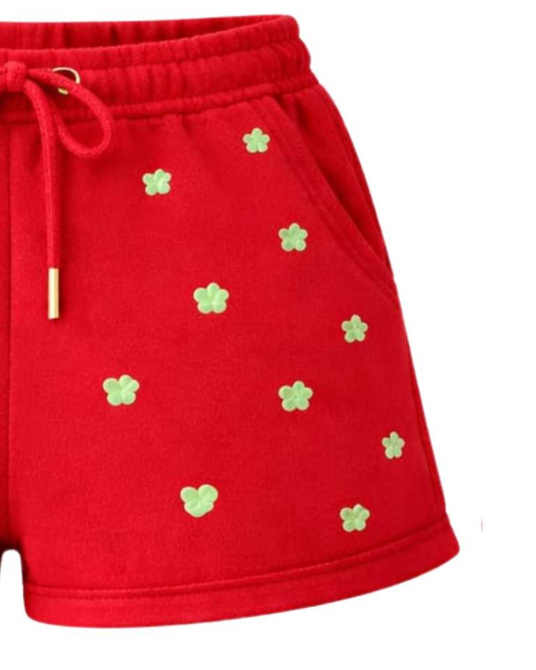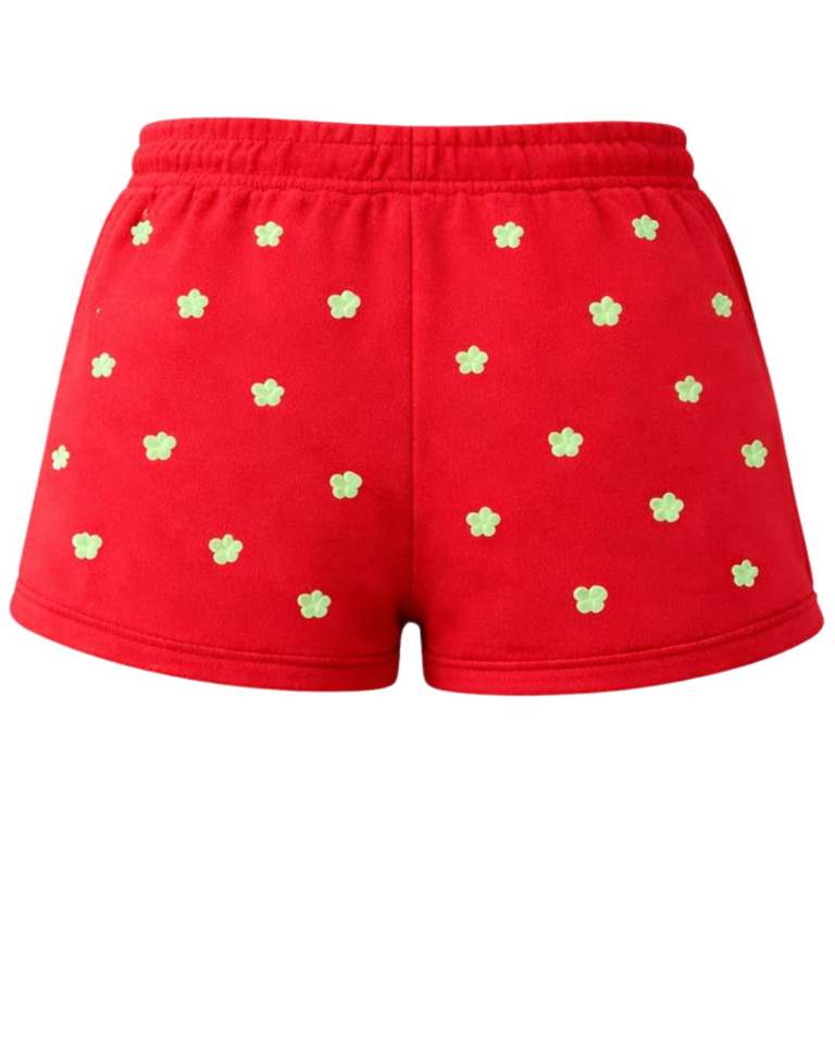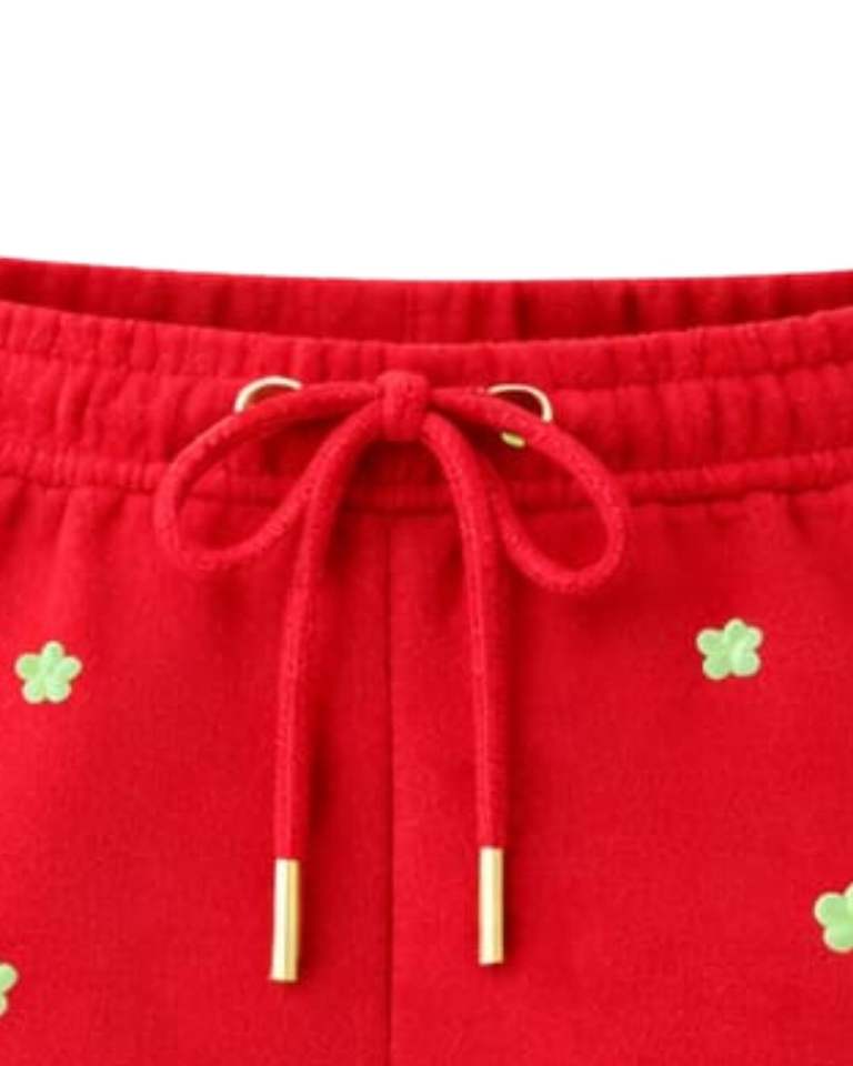 กางเกงขาสั้นผู้หญิงลายโคลเวอร์สีแดงแบบกำหนดเอง ผ้าฝ้ายฟลีซลำลองสำหรับฤดูร้อน เอวแบบรูดเชือก ผู้ผลิตตามสั่ง ขายส่งเสื้อผ้า