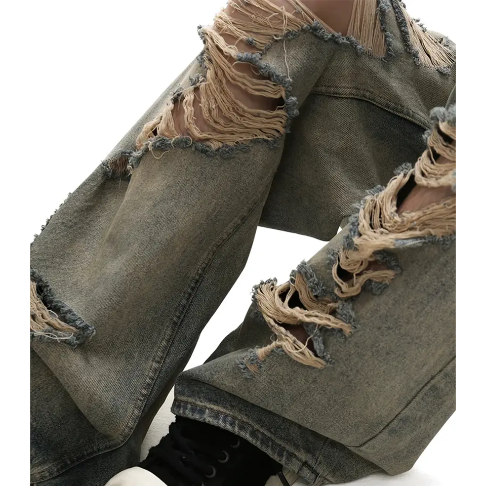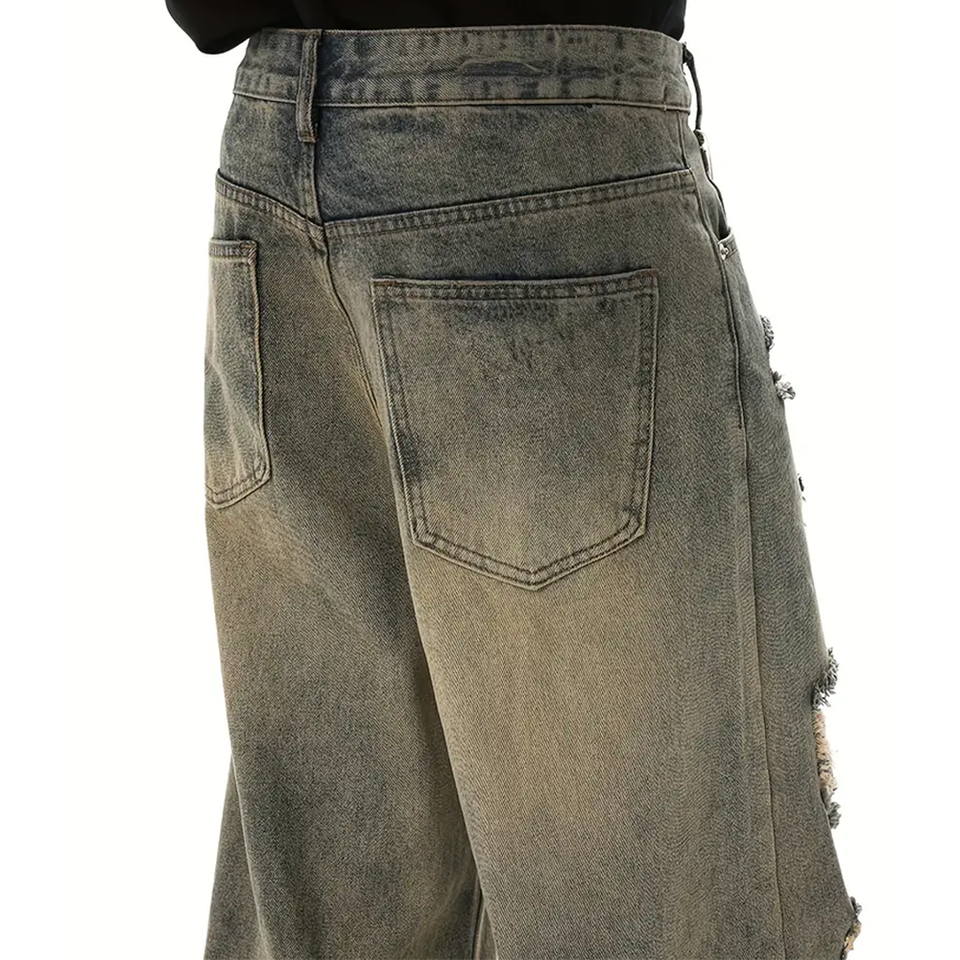 กางเกงยีนส์ผู้ชายสไตล์เรโทร Y2K แบบทำเก่า ขาดๆ ทรงไม่สมมาตร สตรีทแวร์ ทรงหลวม กางเกงคาร์โก้ผู้ชายแบบฟอกสี