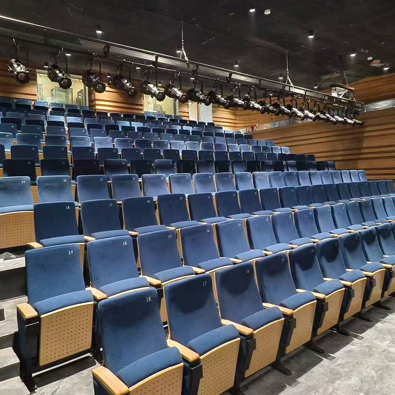เก้าอี้หอประชุมกลางแจ้งผ้าสีน้ำเงินรอยัลแบบปรับแต่งได้ เก้าอี้พับได้ทันสมัยสำหรับห้องประชุม ห้องบรรยาย โรงละคร โรงเรียน บ้าน และสำนักงาน