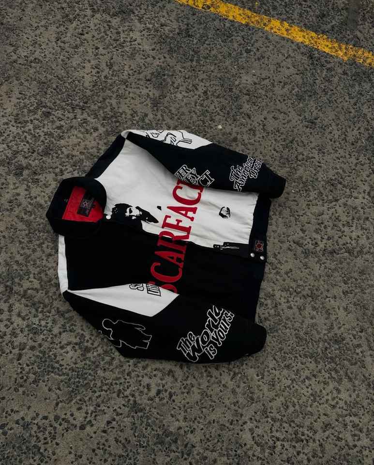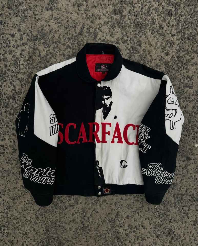 เสื้อแจ็คเก็ตดีไซน์ Scarface แบบสั่งทำพิเศษ "THE WORLD IS YOURS" ผ้าแคนวาสเนื้อแข็ง แจ็คเก็ตสำหรับนักแข่ง