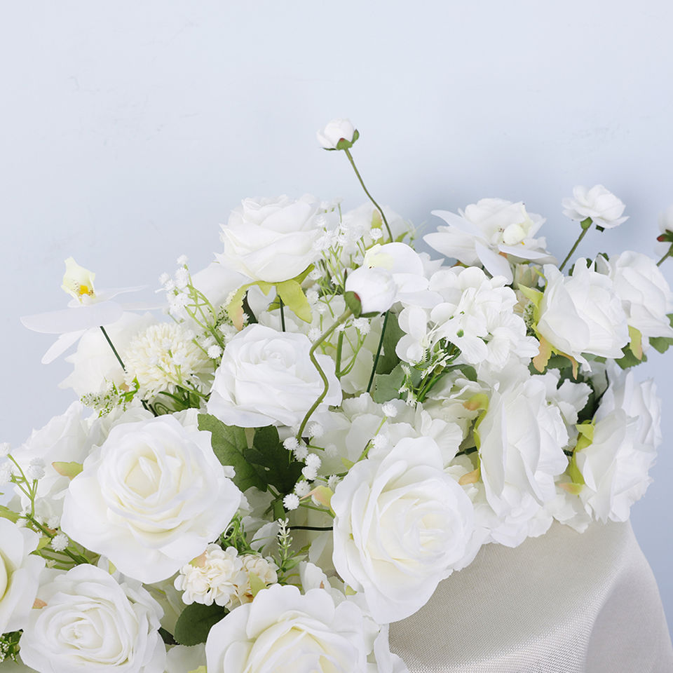 ผ้าปูโต๊ะดอกกุหลาบขาวแบบกำหนดเอง ดอกไม้ประดิษฐ์สำหรับตกแต่งงานแต่งงาน ฉากหลังปลอม ตกแต่งงานแต่งงานด้วยดอกไม้