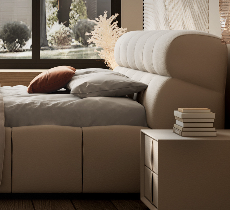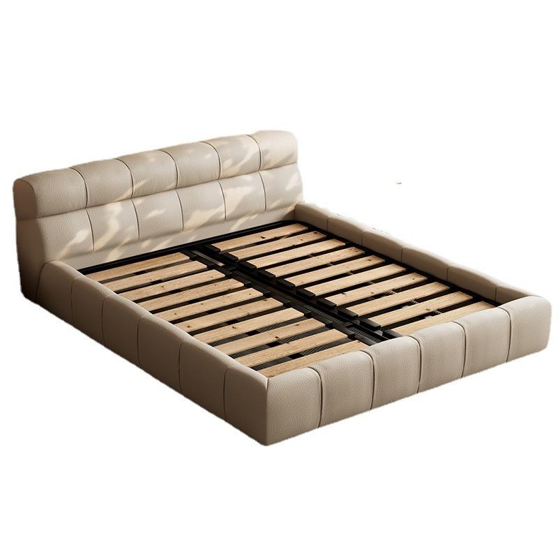 เตียงโครงไม้สนแท้หุ้มหนังแท้สไตล์โมเดิร์นแบบสั่งทำพิเศษ หัวเตียงแบบมีร่องแนวตั้ง พร้อมตัวเลือกที่เก็บของ รับประกัน 1 ปี