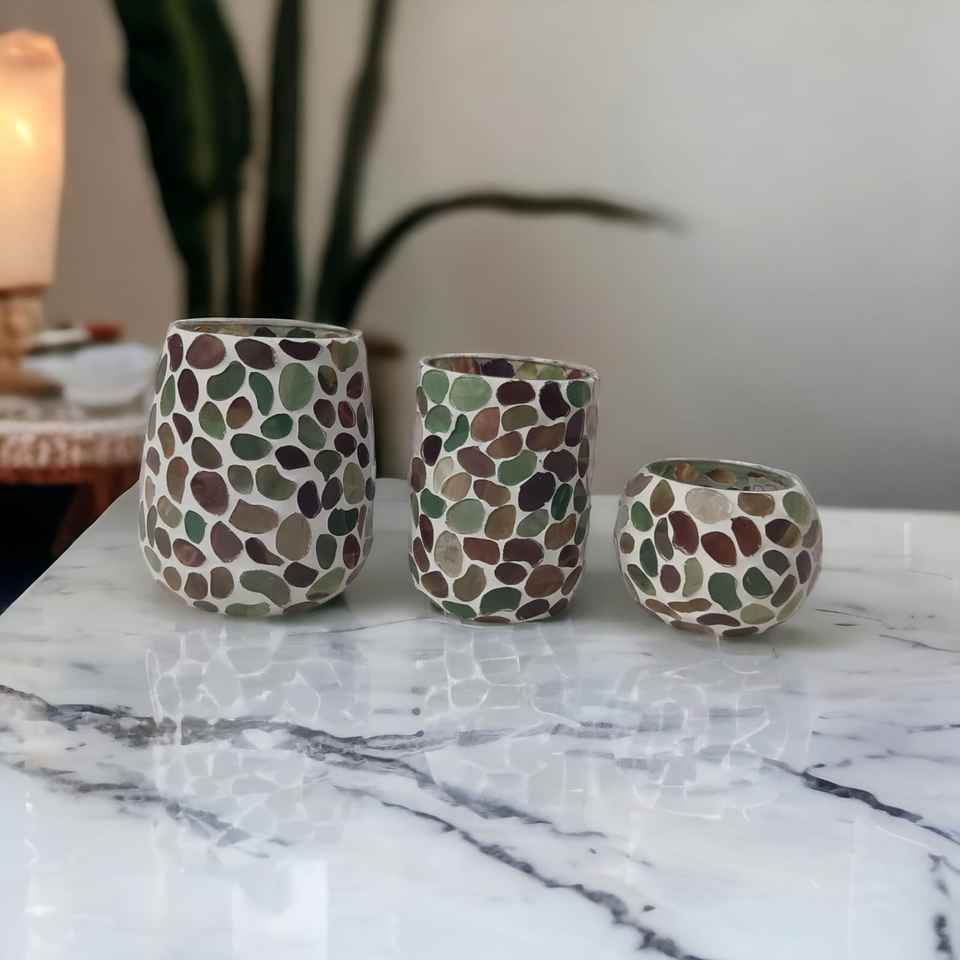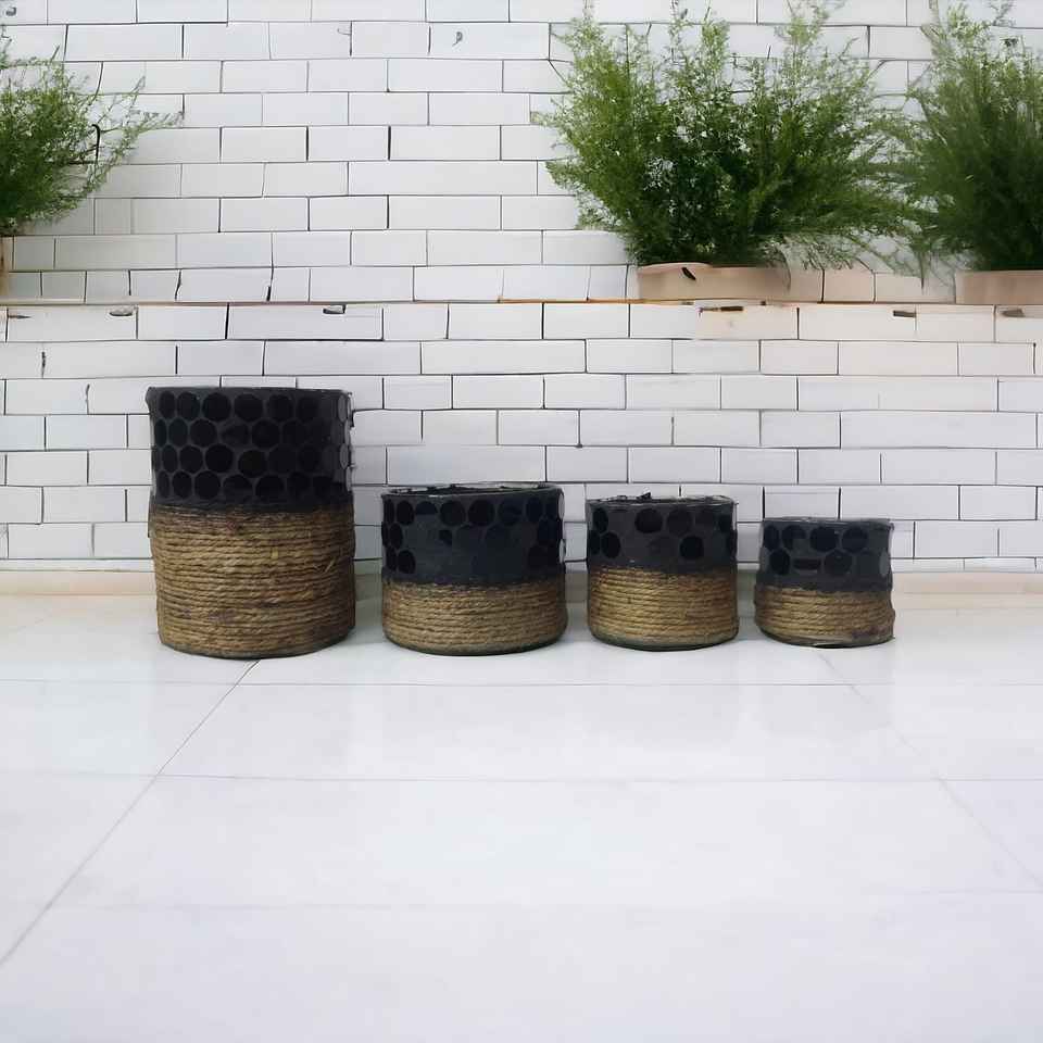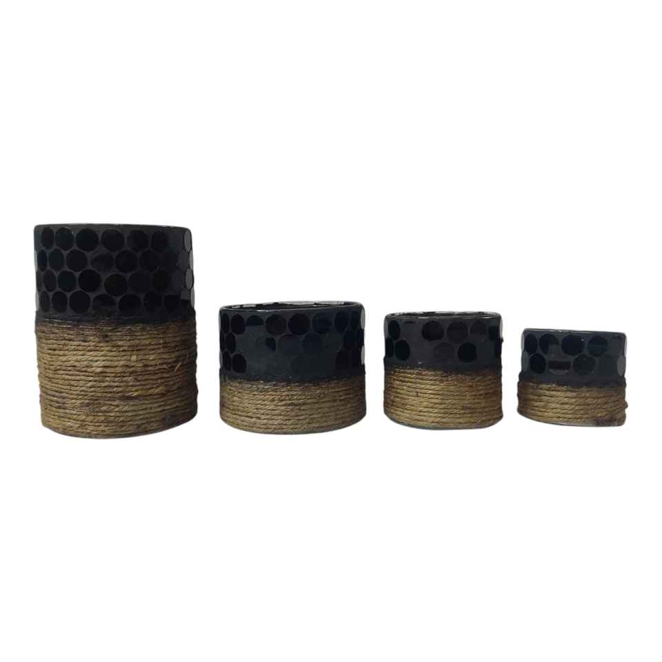 โถแก้วและเทียนโอเอ็มพร้อมโมเสกแก้วสีดำและด้ายปอกระเจาธรรมชาติผลิตด้วยมือในอินเดียขนาดตามสั่ง