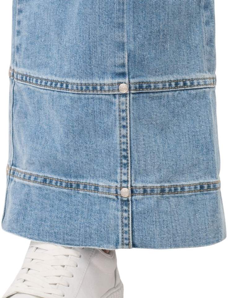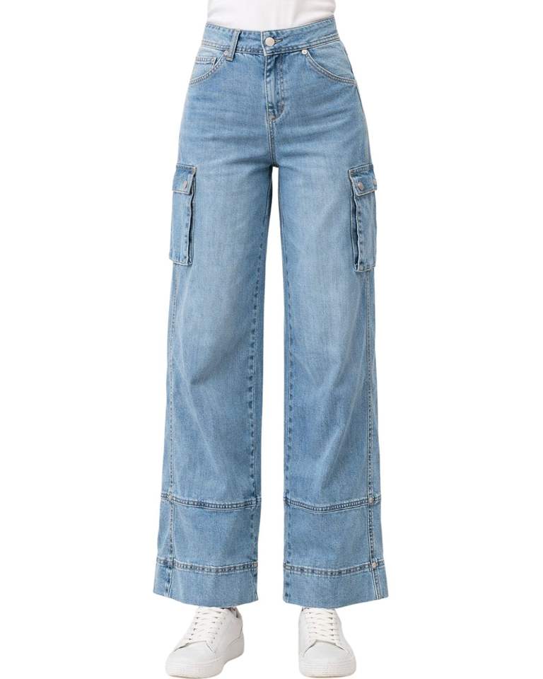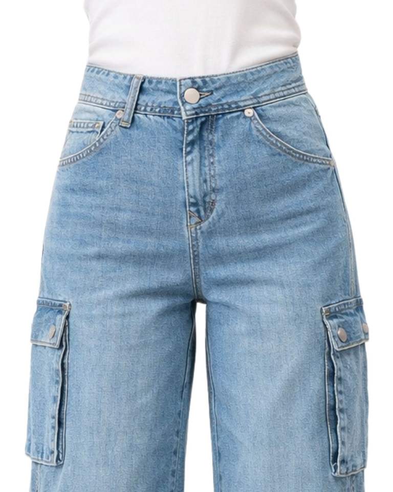กางเกงยีนส์คาร์โก้เอวสูงสีฟ้าสกายบลูแบบสั่งทำพิเศษ ทรงขากว้าง มีกระเป๋าแบบมีฝาปิด สไตล์สตรีทลำลองสำหรับผู้หญิง ทรงหลวม รับผลิตแบบ OEM