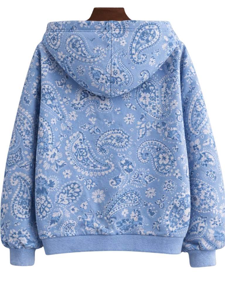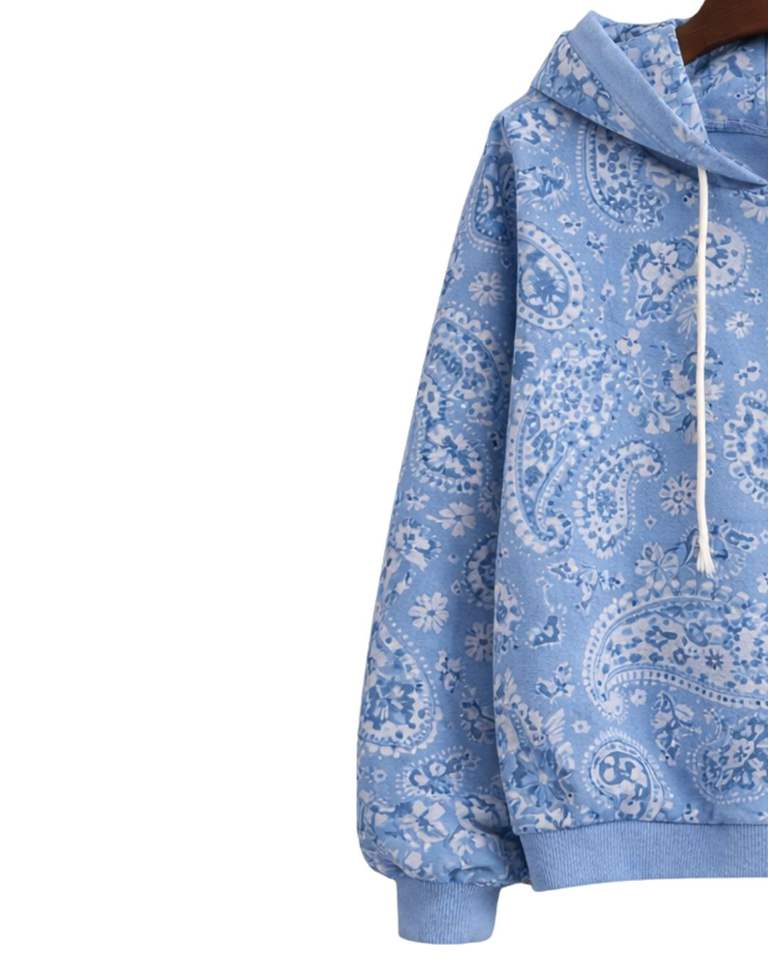 เสื้อฮู้ดดี้ผู้หญิงลายพิมพ์เพสลีย์สีฟ้าสกายบลูแบบกำหนดเอง ผ้าฝ้ายฟลีซ สวมใส่สบาย ผลิตตามสั่ง ผู้ผลิตเสื้อผ้าขายส่ง